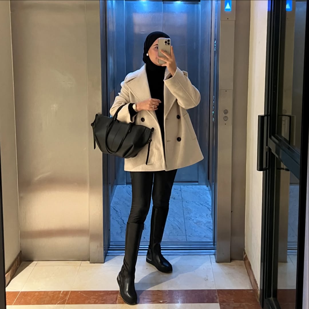 Contemporary modest fashion shines when you layer structured neutral blazers over coordinated dark basics. The cream coat provides warmth while maintaining a polished professional appearance for work or meetings. Leather pants elevate the look beyond typical office wear into fashion forward territory.