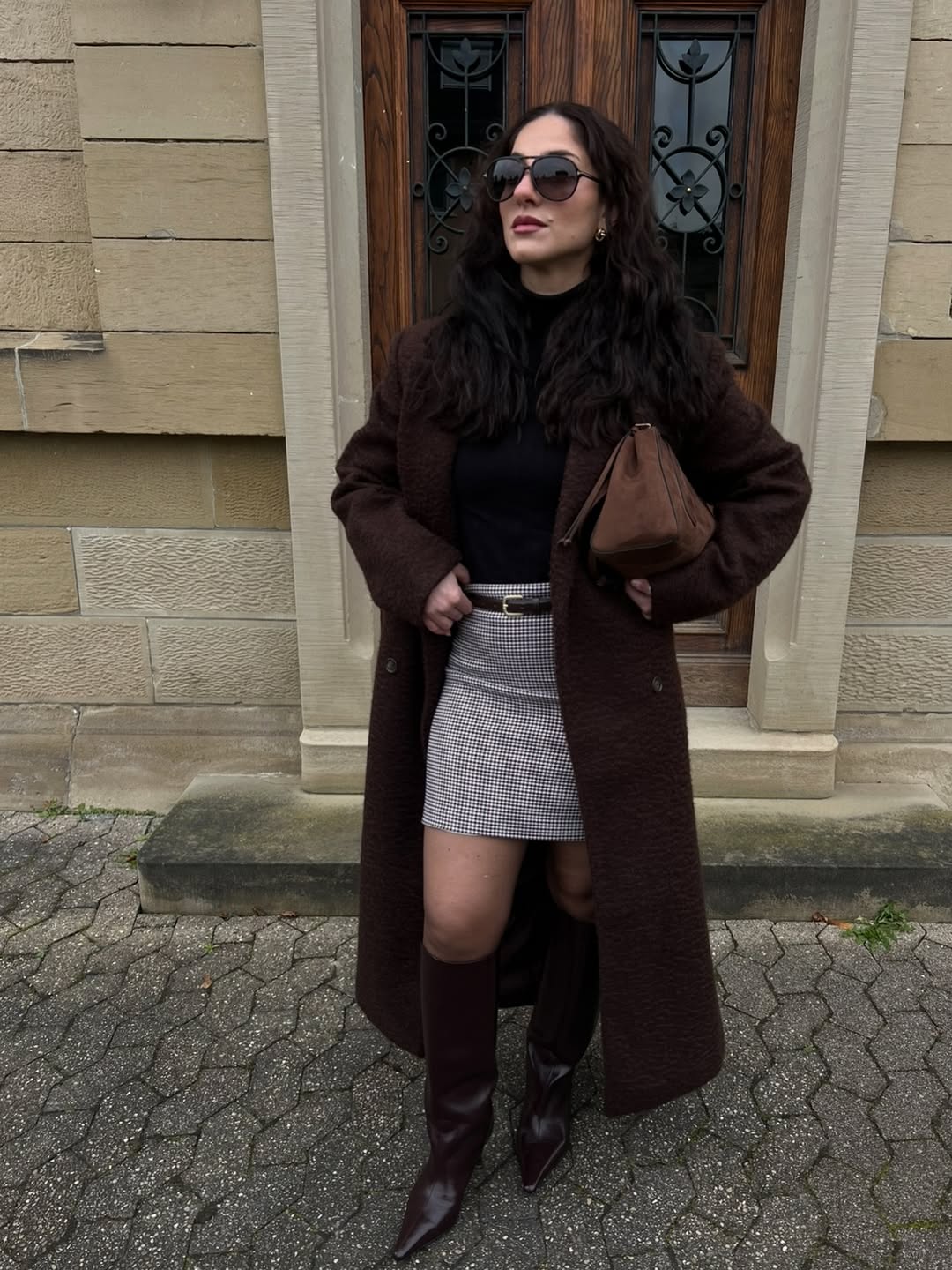 Sophistication emanates from this chocolate brown wool coat extending below the knee for maximum coverage. Underneath, a black turtleneck pairs seamlessly with a mini houndstooth skirt featuring a belt detail. Black knee high boots elongate the silhouette while providing necessary warmth. A triangular brown handbag adds geometric interest to the ensemble. Oversized sunglasses complete this office appropriate winter look that transitions beautifully from professional meetings to evening events.