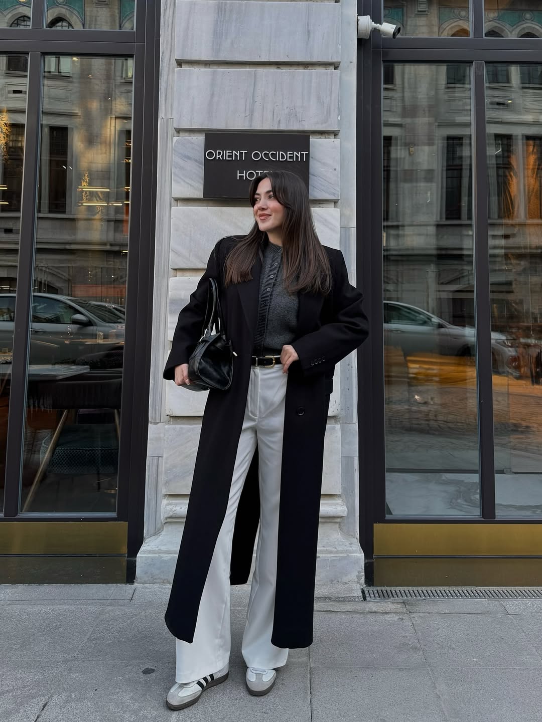 Monochrome minimalism shines through this sophisticated ensemble featuring a floor length black coat. Crisp white wide leg trousers create striking contrast while a charcoal gray knit top bridges both colors harmoniously. A black leather belt cinches the waist, adding structure to the flowing silhouettes. White sneakers with black stripes keep the look grounded and comfortable. A slouchy black shoulder bag completes this effortlessly chic urban winter style.