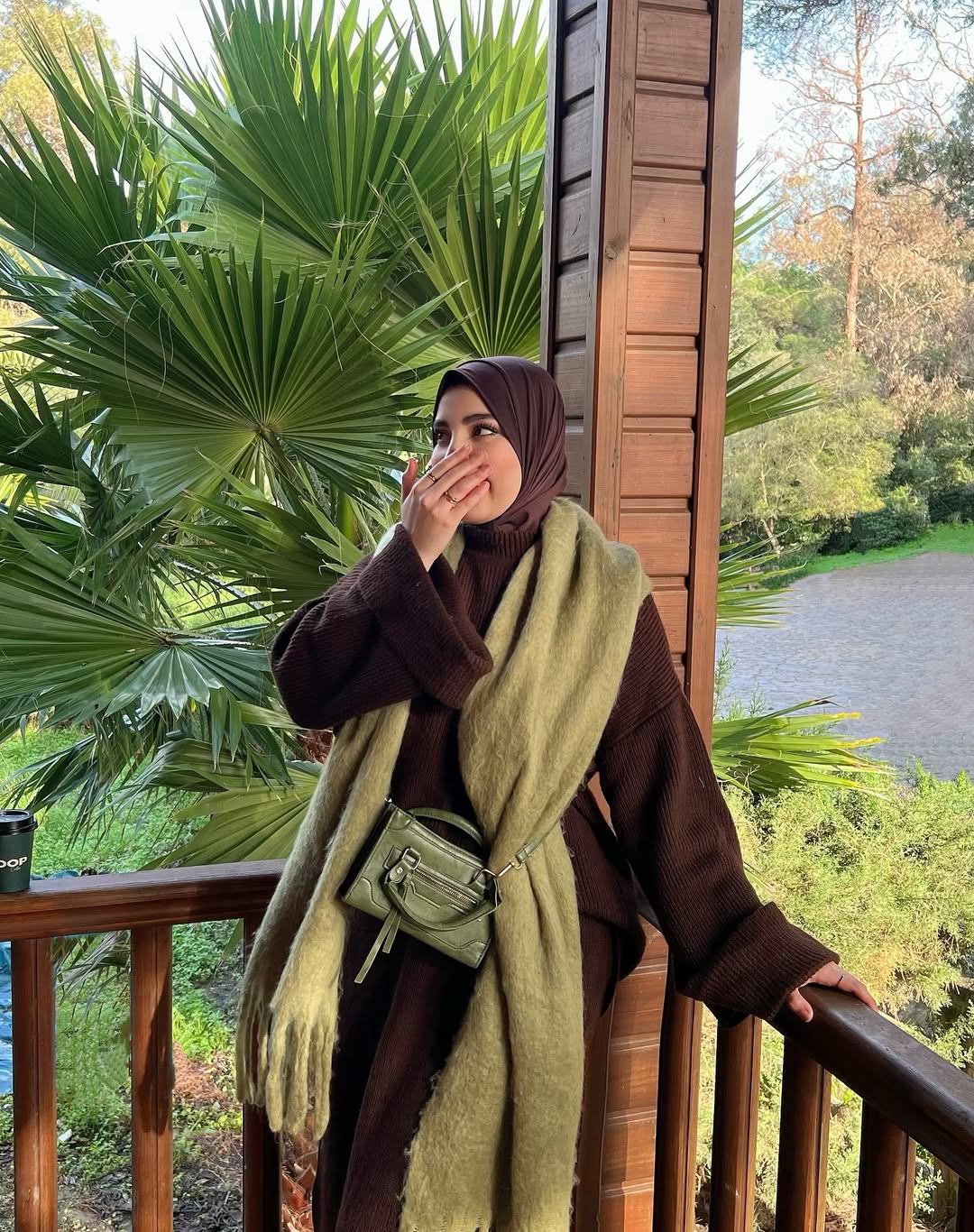 Earthbound tones merge beautifully in this modest winter ensemble featuring an oversized chocolate brown ribbed sweater. An olive green textured scarf drapes gracefully across the body, adding visual depth and extra warmth. A matching brown hijab coordinates seamlessly with the sweater’s rich hue. A small olive crossbody bag sits at the waist, keeping essentials accessible. This color combination works wonderfully for casual outdoor activities while maintaining covered elegance and comfort throughout chilly days.
