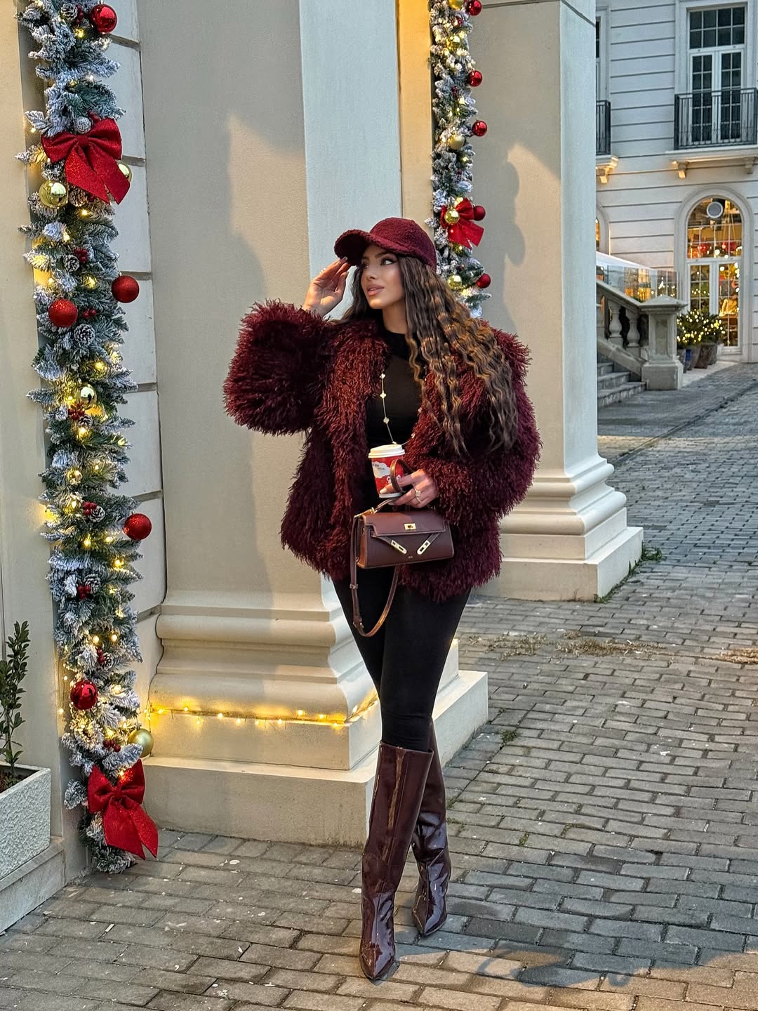 Festive vibes radiate through this rich burgundy faux fur jacket paired with coordinating beret. Black leggings create a sleek base that grounds the statement outerwear beautifully. Glossy brown ankle boots add refined sophistication while a crossbody bag keeps essentials close. This ensemble works wonderfully for holiday shopping or casual winter gatherings. The monochromatic burgundy accessories tie everything together seamlessly, proving that matching pieces create cohesive style.