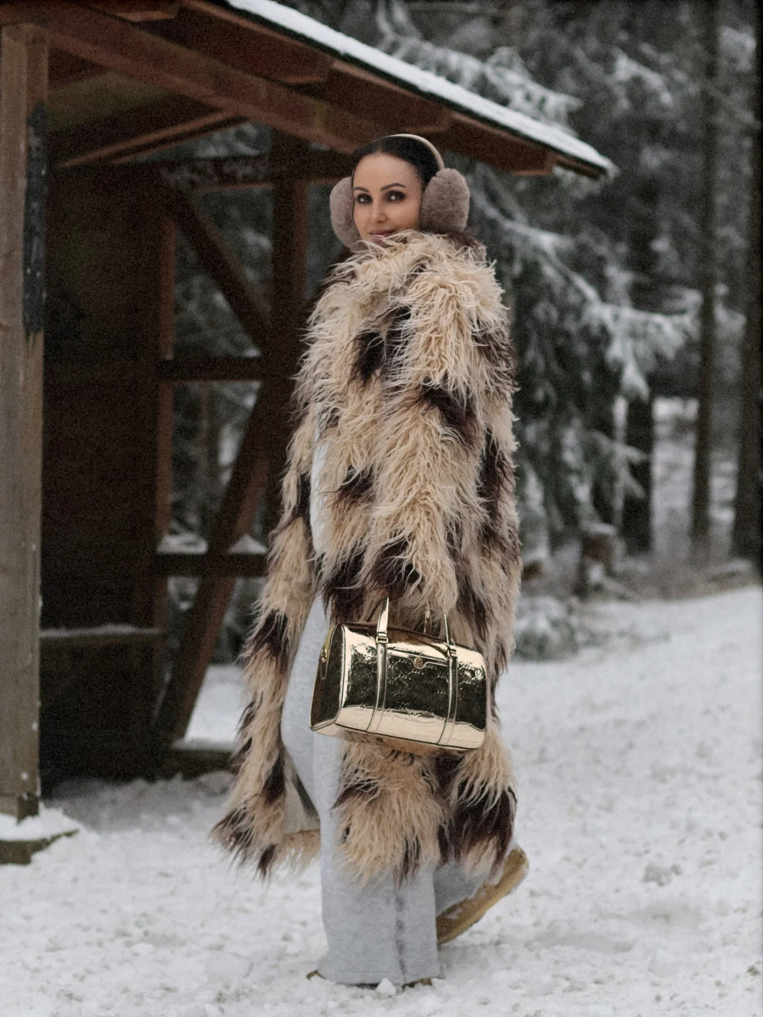 Snowfall backdrops demand statement pieces that merge warmth with glamour. This beige shaggy textured coat delivers both, cascading down to ankle length while creating a cozy silhouette. Paired with fluffy earmuffs and metallic gold clutch, the outfit balances practicality against sophisticated winter styling. Light-colored pants complement the neutral palette, allowing the coat’s dramatic texture to shine as the focal point of this cold-weather look.