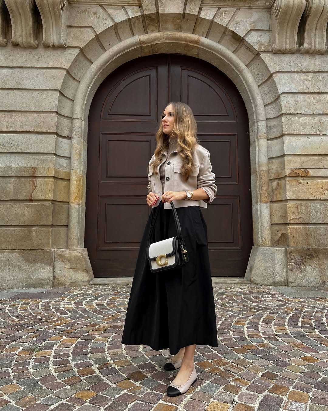 Understated elegance flows from this beige cropped jacket paired with a flowing black midi skirt. Two tone ballet flats echo the neutral and black color scheme beautifully. A structured handbag in matching colors completes this refined European style outfit.