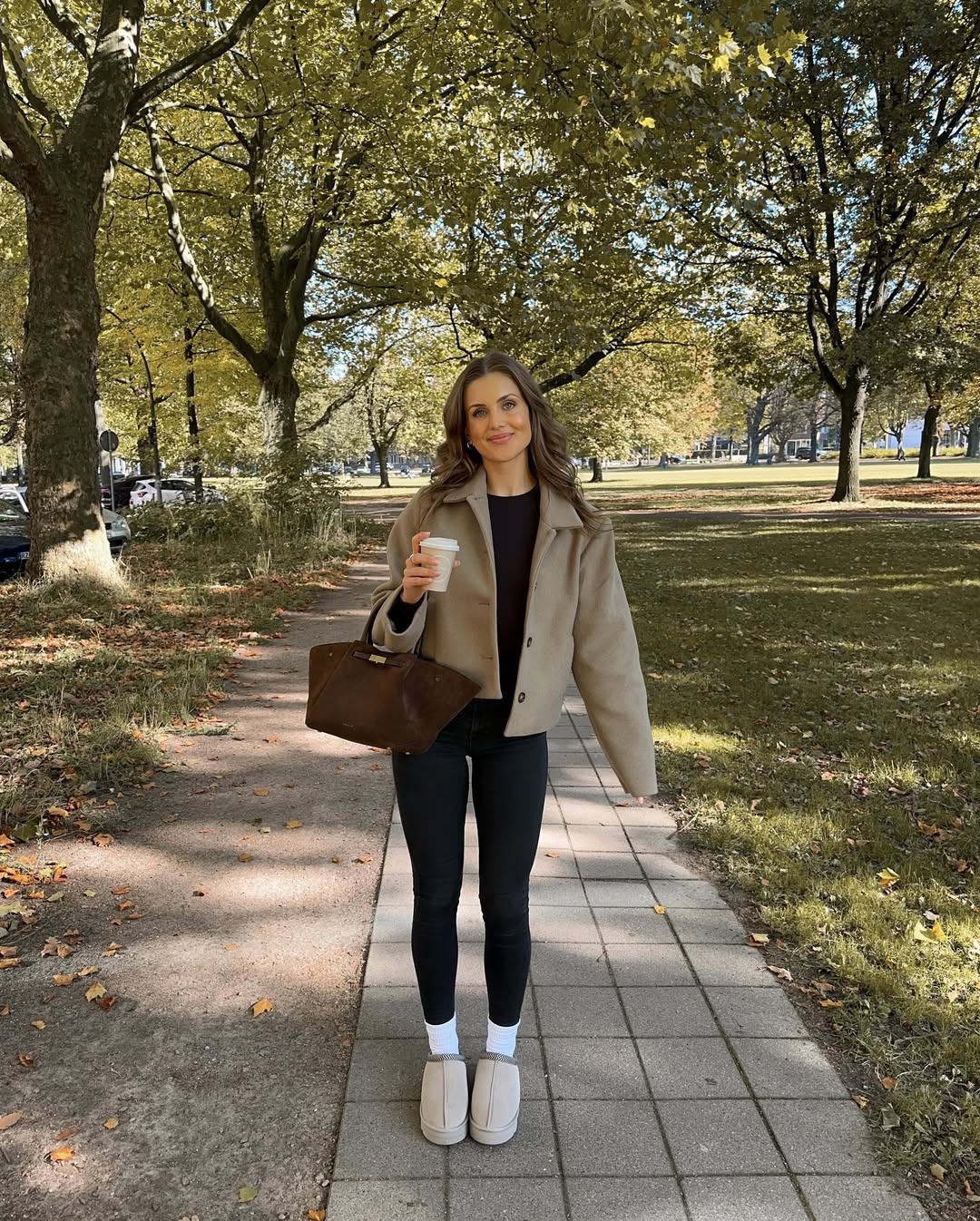 Effortless athleisure styling emerges from this beige cropped jacket layered over a black sweater and leggings. White platform sneakers with socks add a sporty casual touch for park strolls. A brown leather handbag brings sophistication to the comfortable athletic inspired outfit.