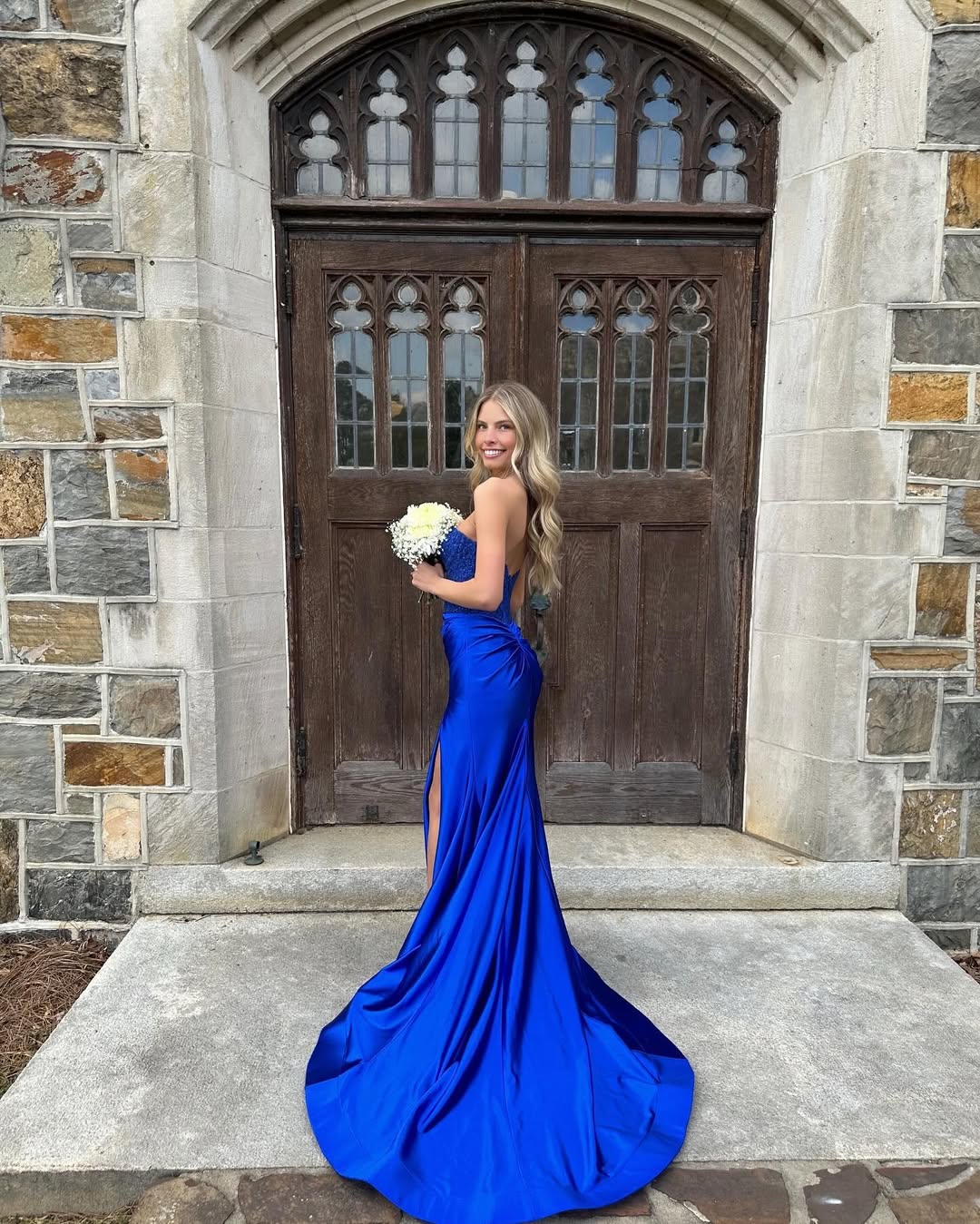 A sweeping cathedral train creates breathtaking impact from behind. The rich cobalt blue commands attention, while the sleek design offers timeless elegance. This sophisticated statement piece radiates confidence and unforgettable presence.