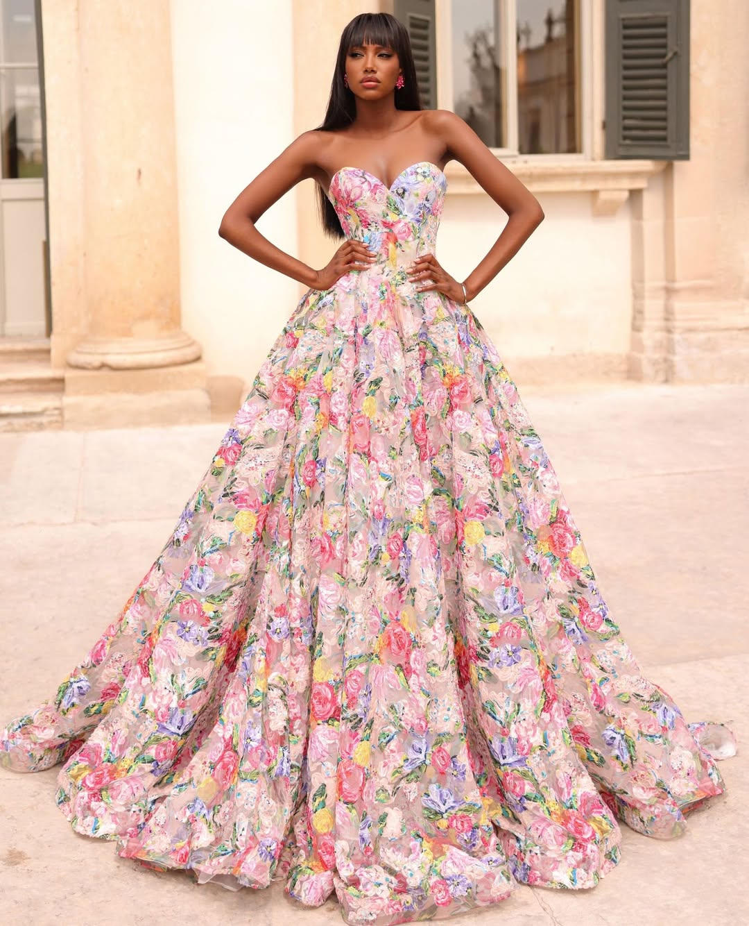 This breathtaking floral gown bursts with vibrant hand-painted roses in pink, yellow, and lavender hues. The structured sweetheart bodice flows into a magnificent full skirt with dramatic volume and an extended train. Each petal seems to dance across the fabric, creating a living garden effect that commands absolute attention.