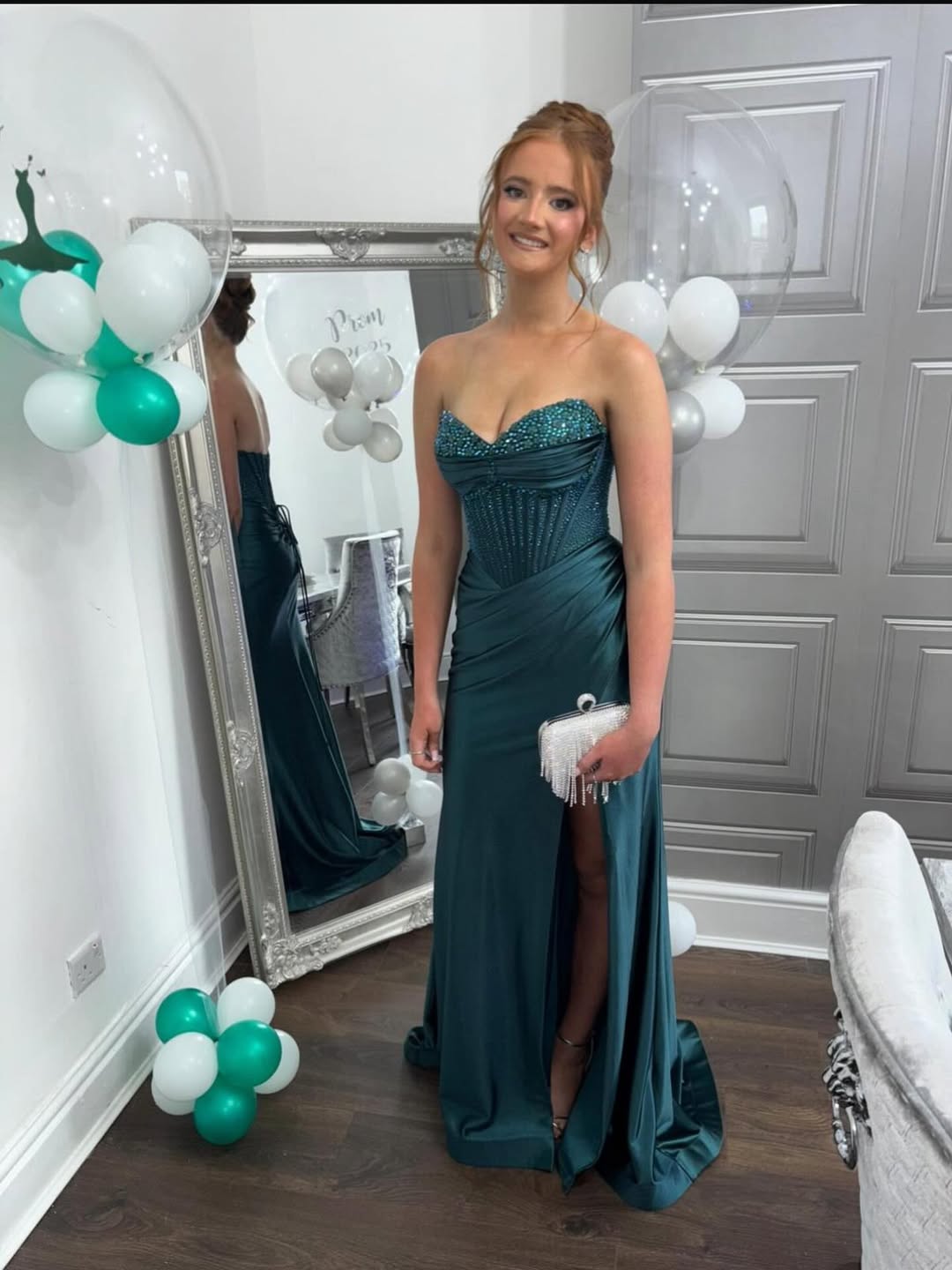 This stunning emerald green strapless gown features a crystal-embellished sweetheart neckline that sparkles brilliantly. Draped satin fabric wraps the fitted bodice, creating elegant dimension and structure.