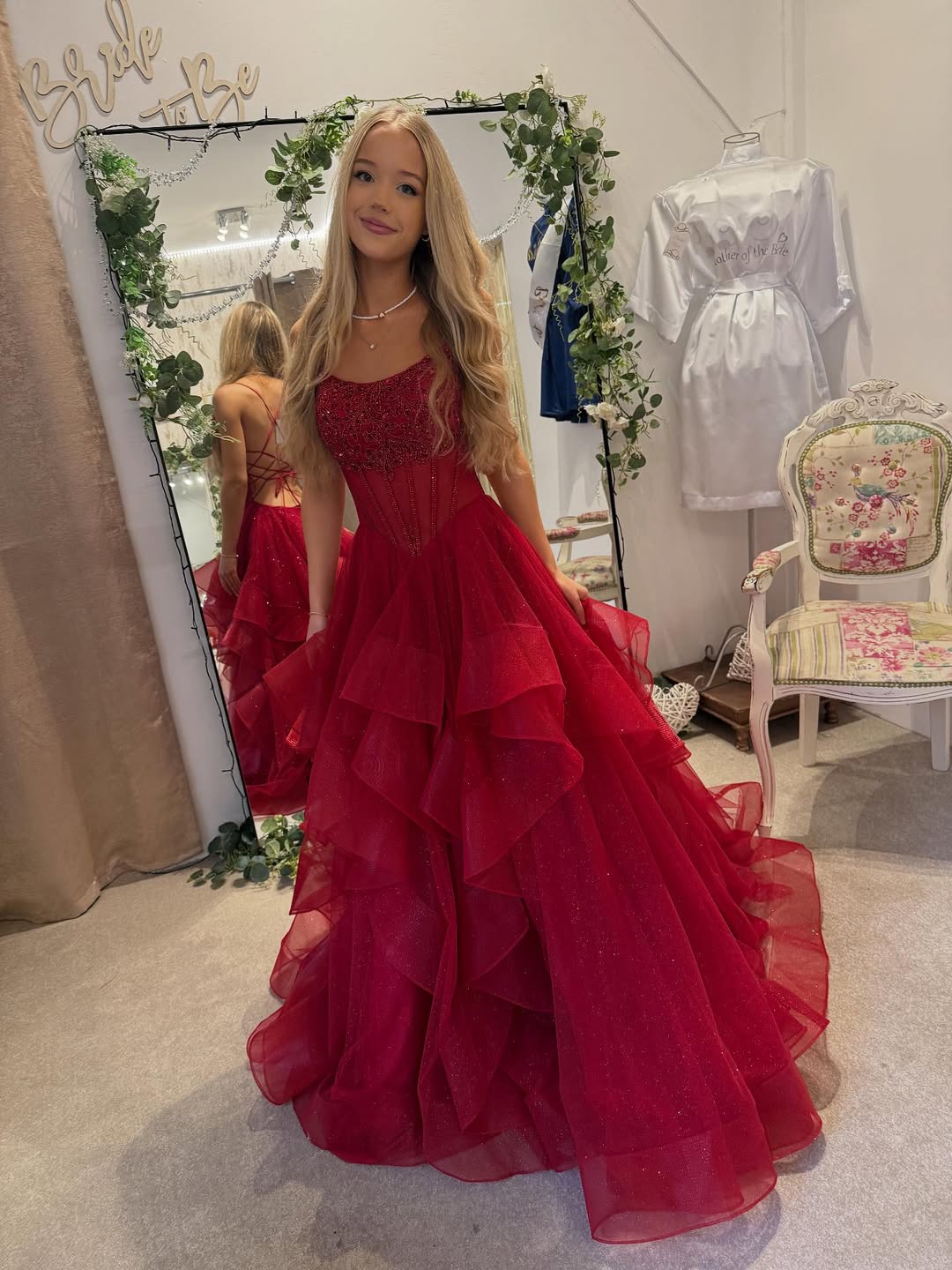 This dramatic red gown commands attention with its embellished strapless bodice and cascading tiered ruffles. The voluminous silhouette creates an unforgettable entrance, while subtle sparkle catches every light. Bold yet romantic, this statement piece transforms you into the main character of any formal event, leaving everyone speechless.