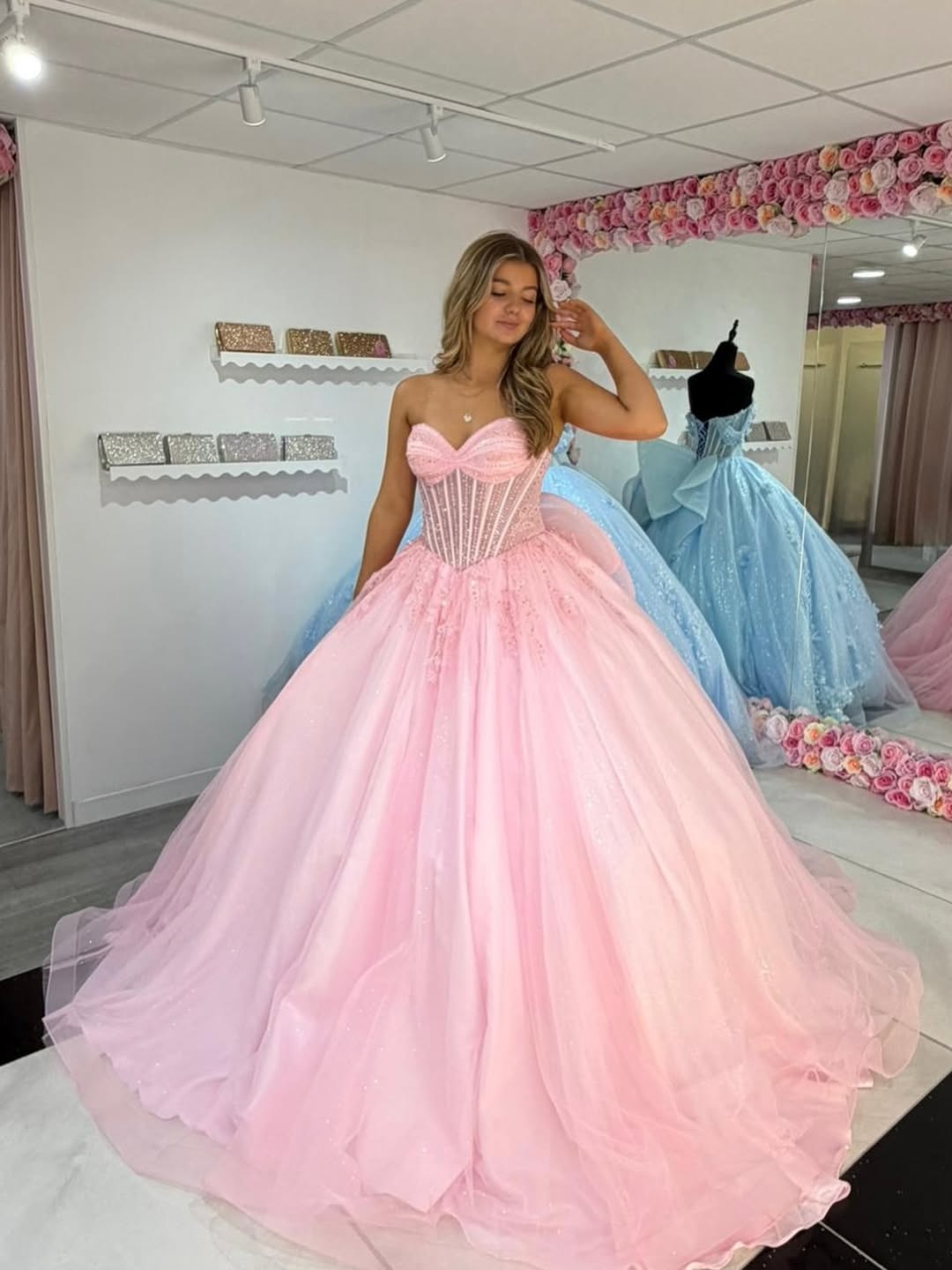 This enchanting pink ball gown features a structured corset bodice with delicate beading that radiates outward like sunbursts. Layers of soft tulle create a fairytale silhouette that demands center stage. The strapless sweetheart neckline adds timeless elegance, making this gown an irresistible choice for those who want to steal every glance.