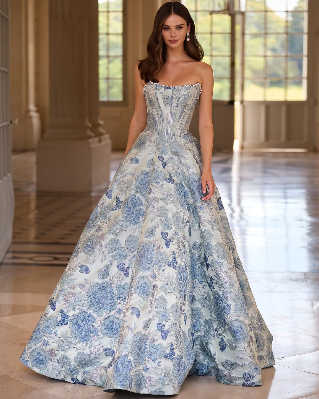 10. Blue Floral Jacquard Ballgown with Structured Corset