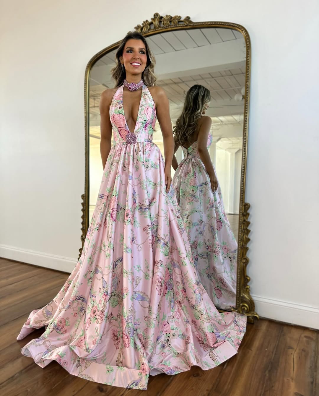 2. Floral Halter Ballgown with Plunging Neckline