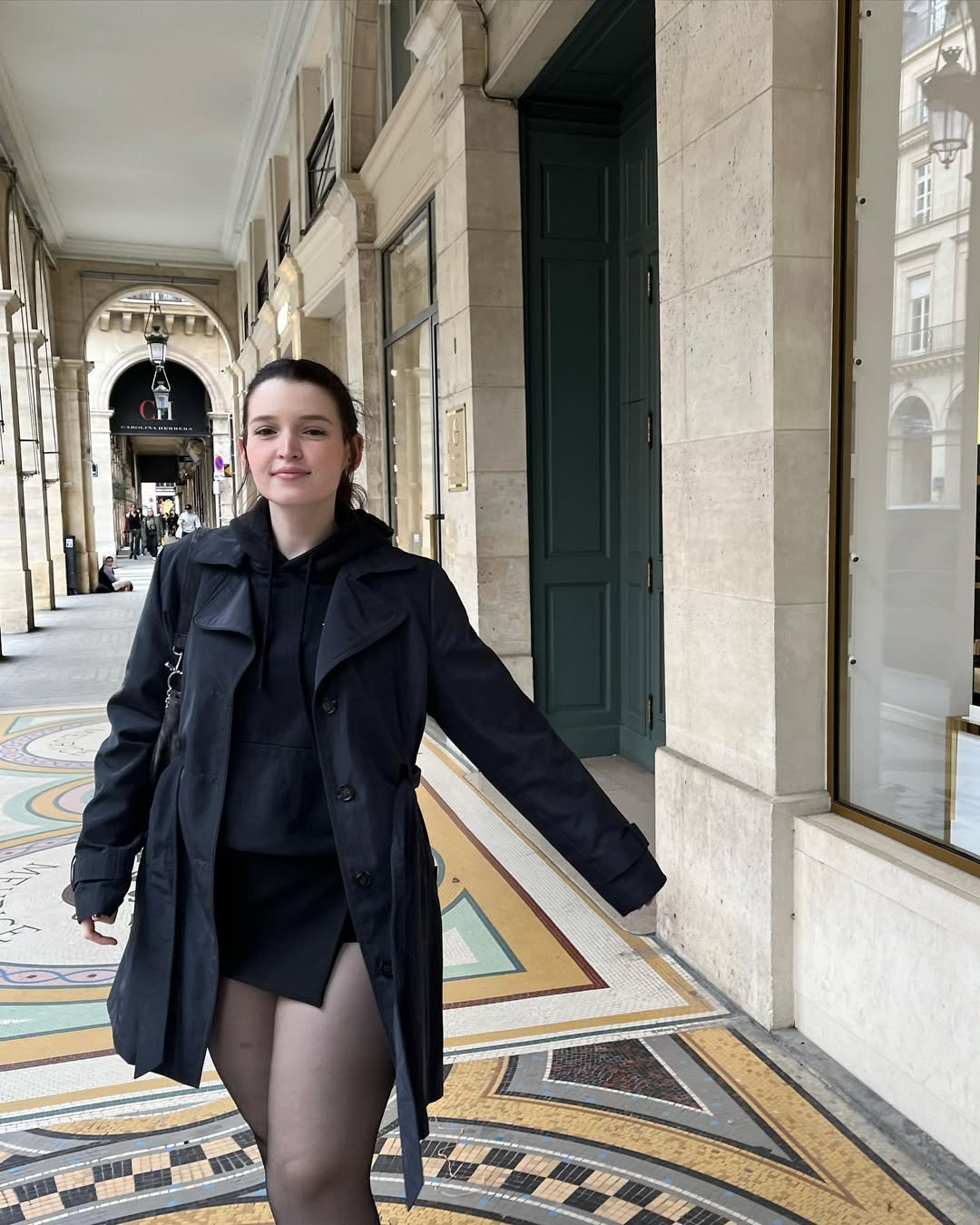 Layering pieces in matching tones creates a streamlined appearance that elongates your frame. The trench coat’s structured design provides wind protection without sacrificing style. Black tights complete this cohesive look, making it suitable for shopping trips or gallery visits.