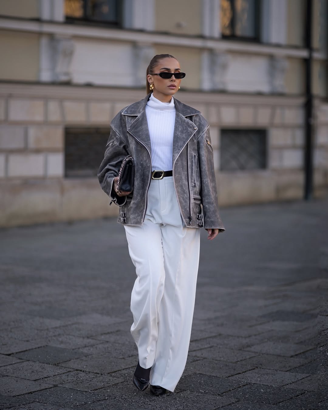 Achieving edgy sophistication defines this winter outfit idea for women featuring a gray suede moto jacket. Pairing the oversized jacket with an all white base creates striking contrast that commands attention. Black accessories including sleek sunglasses and pointed heels add sharpness to the soft color palette.