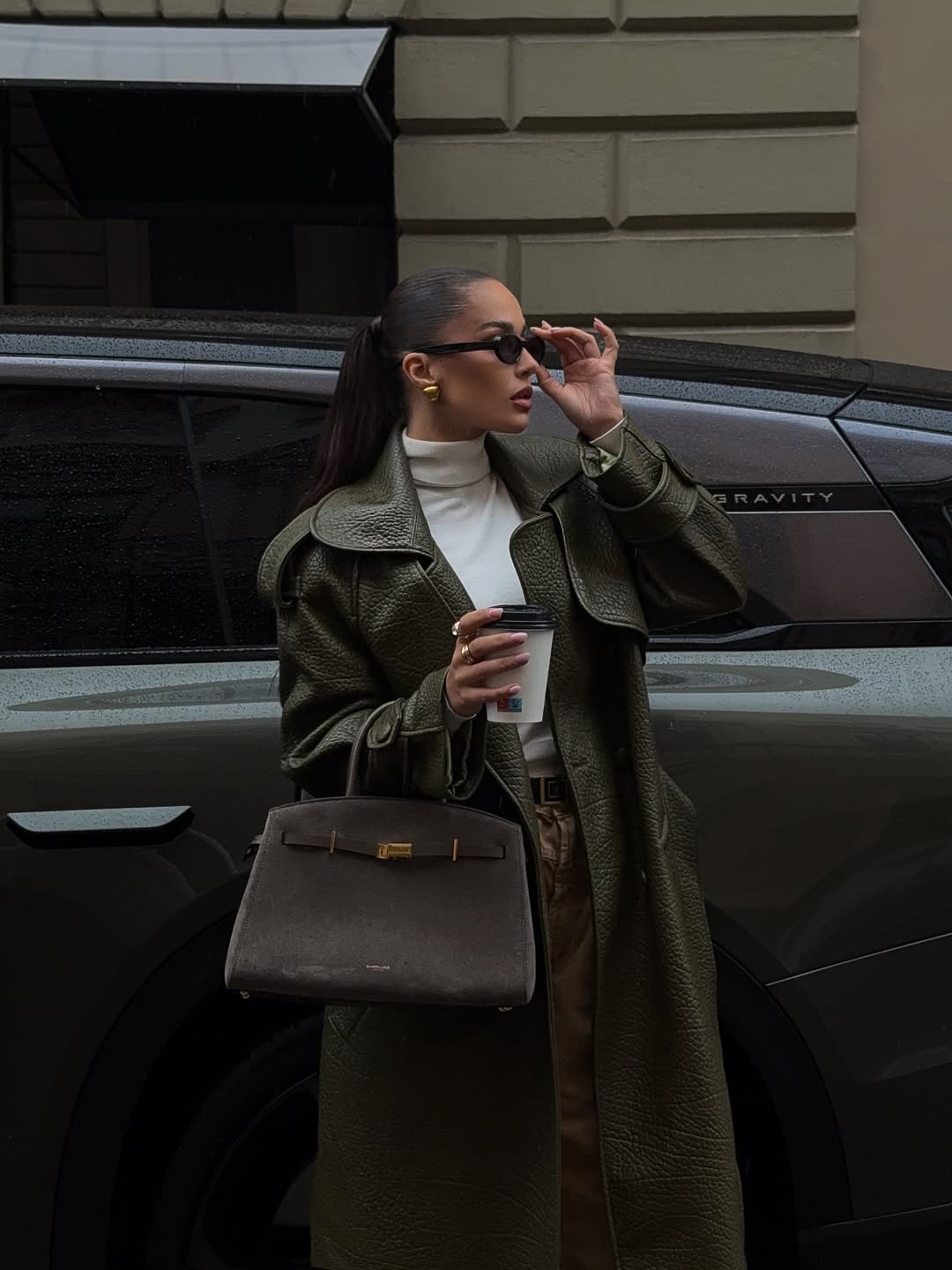 Coordinating your outerwear with matching accessories elevates the entire ensemble to luxury status. Dark sunglasses and gold jewelry add finishing touches to this polished look. The rich olive tone offers a refreshing alternative to standard black coats.