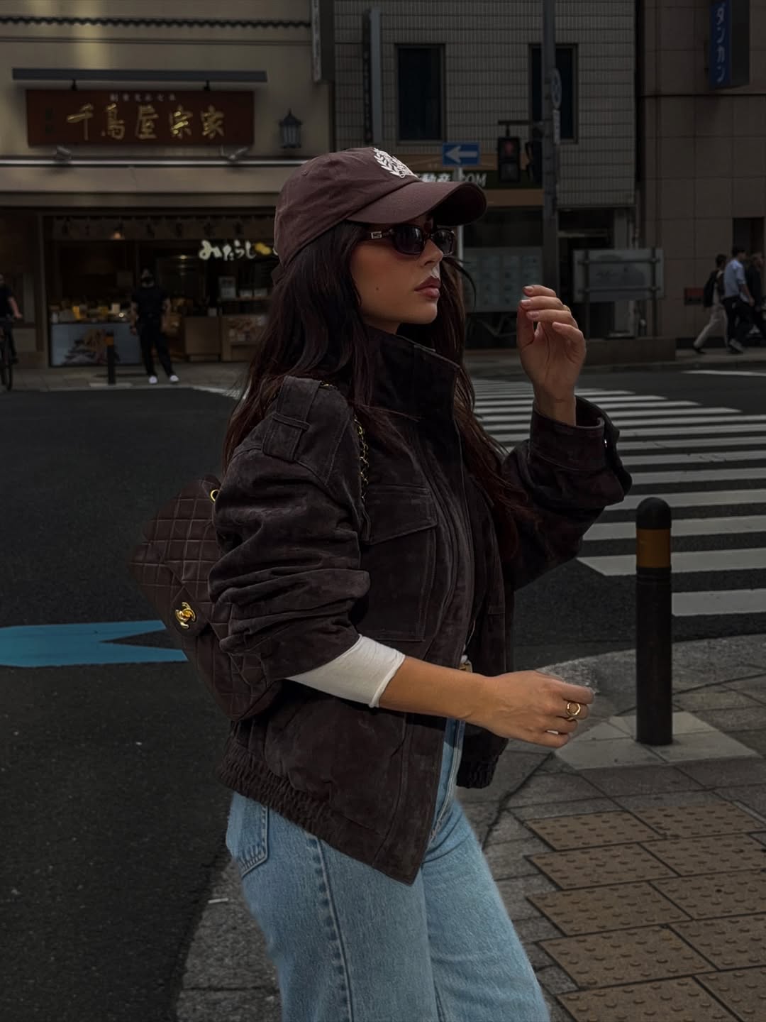 Navigating city streets requires practical yet stylish winter outfit ideas for women like this brown denim jacket combination. Pairing the oversized jacket with light wash jeans creates tonal depth through varied shades. A matching baseball cap and dark sunglasses complete this casual urban aesthetic.
