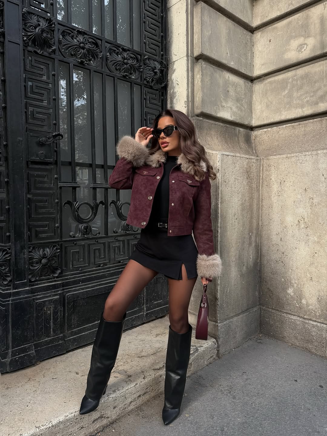 Exuding luxurious warmth requires a burgundy suede cropped jacket with plush fur collar and cuffs. This stunning winter outfit idea for women pairs rich jewel tones with all black basics underneath. Knee high leather boots elongate legs while a matching burgundy handbag creates cohesive color coordination throughout.