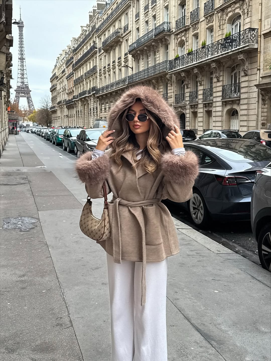 Monochromatic styling shines through this refined color palette of beiges and whites. The faux fur hood and cuffs deliver both visual drama and practical insulation. Round sunglasses contribute vintage Hollywood glamour to this polished street style moment.
