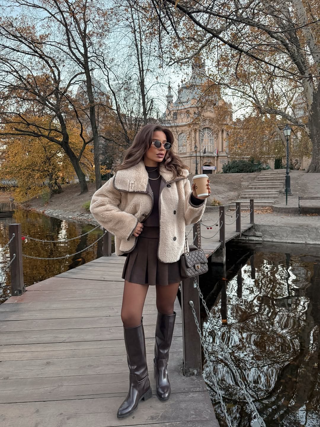 Exemplifying European chic requires a cream teddy jacket paired with a brown pleated mini skirt. This sophisticated winter outfit idea for women balances cozy textures with feminine silhouettes beautifully. Black knee high boots and a quilted crossbody bag add refinement to this neutral toned ensemble.