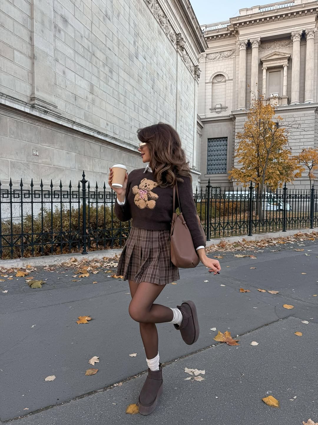 Combining schoolgirl inspired plaid patterns with whimsical graphics creates approachable fashion that feels fresh and fun. Brown suede boots with white socks provide cozy warmth while maintaining the outfit’s cohesive color story. A tan shoulder bag completes this polished yet playful look.