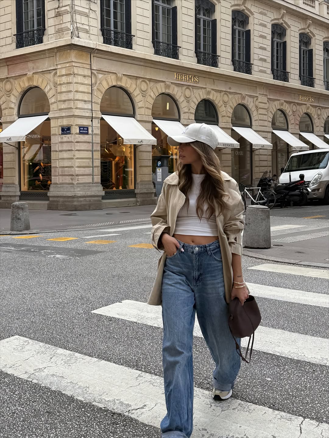Timeless elegance meets everyday practicality in this sophisticated street style combination. A cream trench coat drapes beautifully over a cropped white tee and high-waisted blue jeans. The ensemble radiates Parisian chic while providing adequate coverage against brisk temperatures during urban adventures.