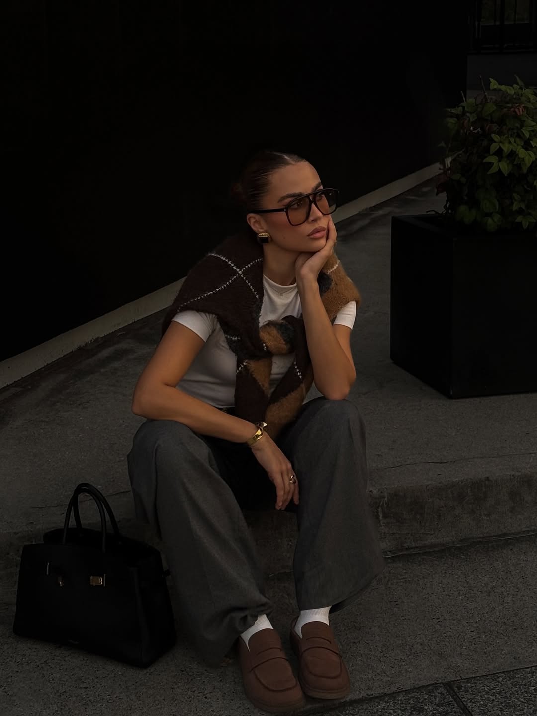 Mastering layered sophistication starts with a brown argyle knitted vest worn over a white tee. This preppy winter outfit idea for women combines casual comfort with refined styling. Gray wide leg trousers create relaxed elegance while brown loafers tie the earth tones together harmoniously.
