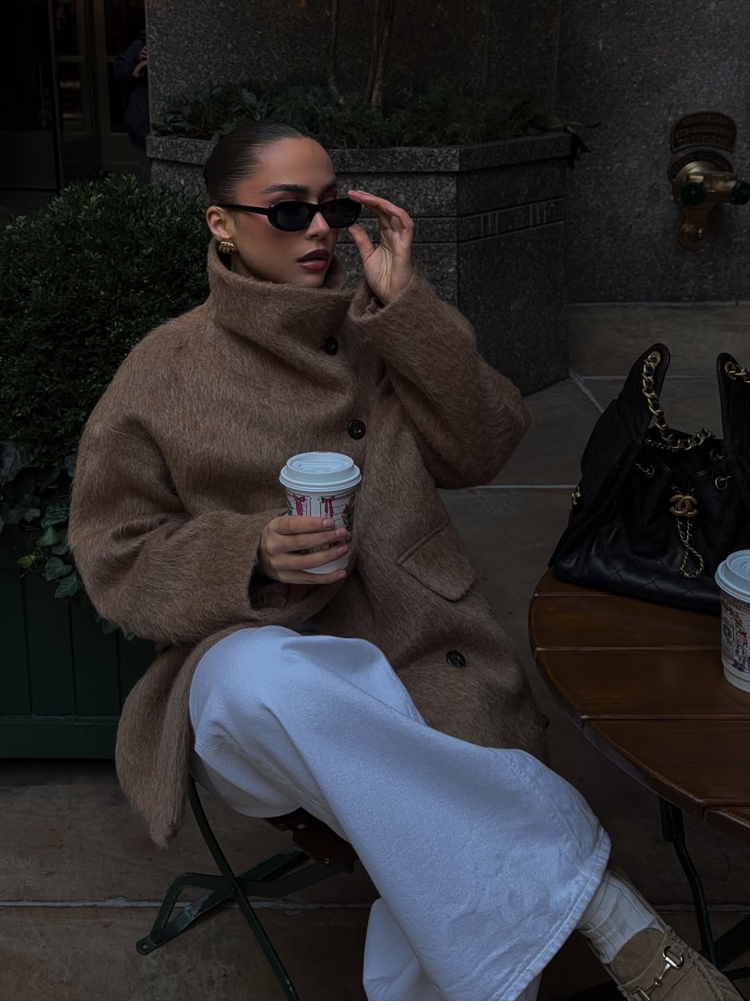 Savoring coffee outdoors becomes stylish with a camel toned wool coat featuring an oversized collar. This cozy winter outfit idea for women pairs beautifully with crisp white trousers for tonal contrast. Dark sunglasses and gold earrings complete this effortlessly chic cafe look.
