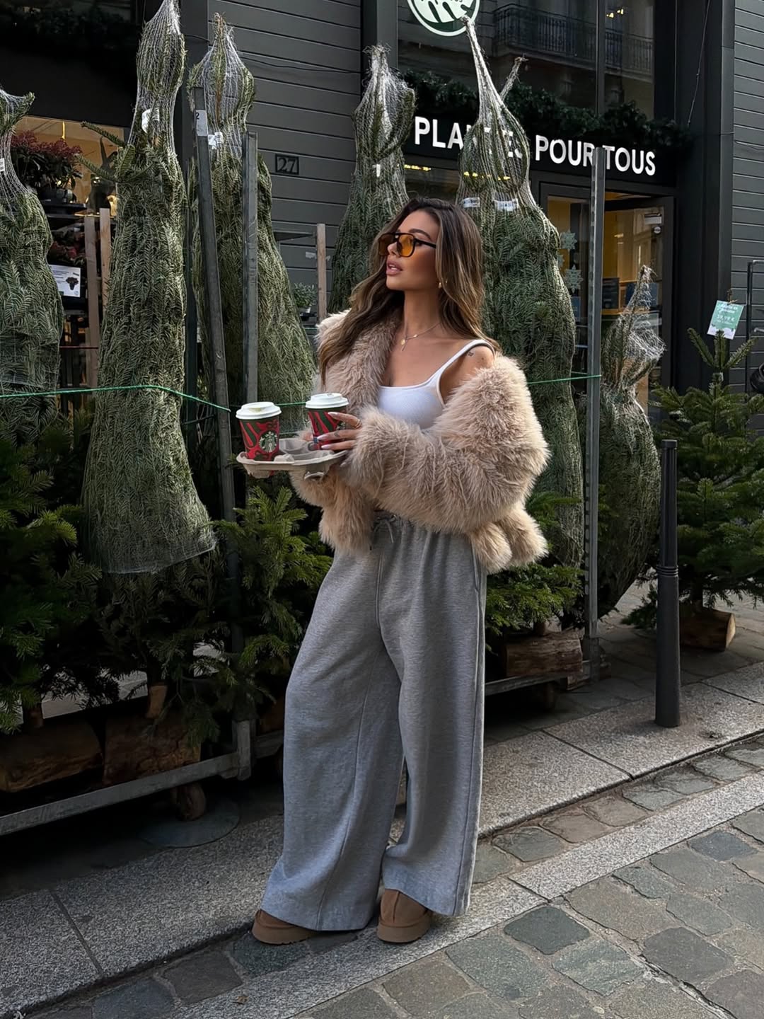 Bundling up doesn’t mean sacrificing style this season. This comfortable ensemble features a luxurious faux fur cardigan paired with relaxed gray sweatpants and a classic white tank. The textured outerwear adds warmth while maintaining an effortlessly chic vibe for casual coffee runs or weekend errands.