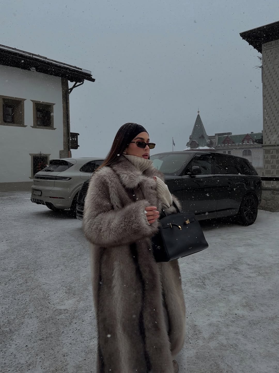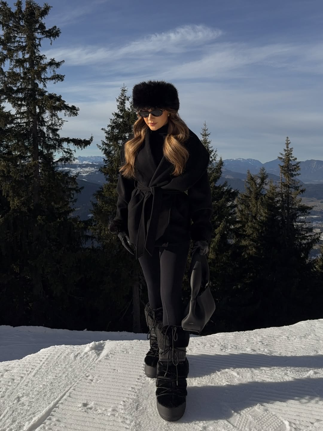 Conquering mountain peaks requires sophisticated winter outfit ideas for women like this all black ensemble with oversized fur hat. Combining a belted black coat with matching trousers creates sleek monochrome elegance against snowy backdrops. Black fuzzy snow boots and aviator sunglasses complete this glamorous yet functional alpine styling.