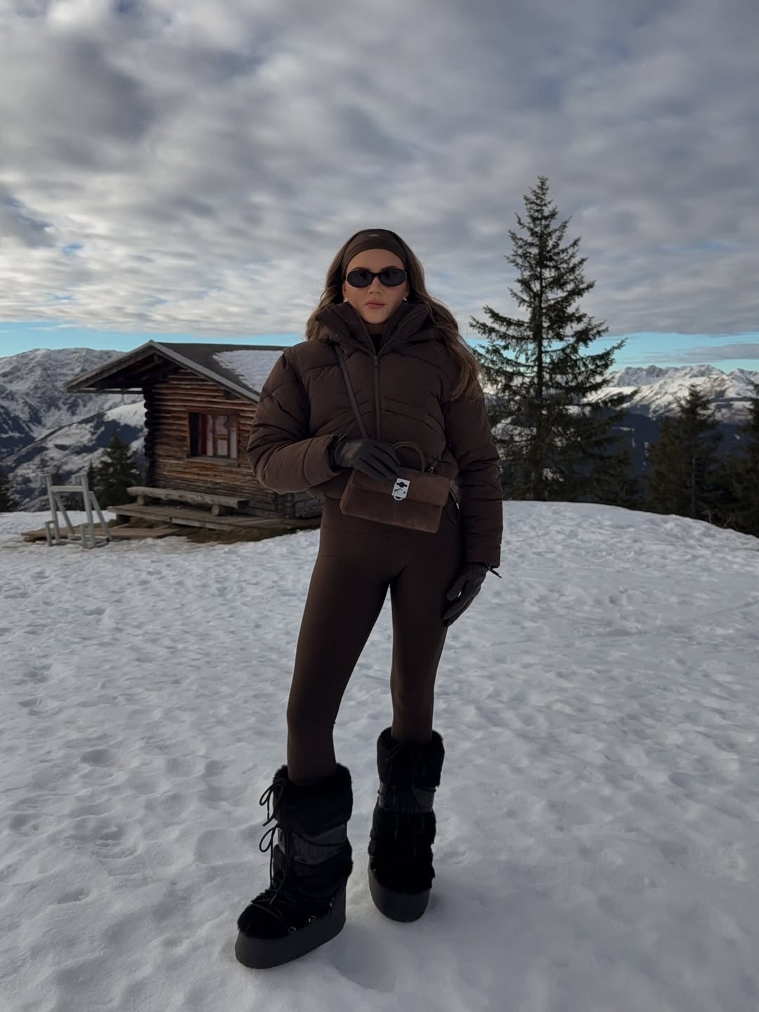 Tackling snowy mountain terrain demands practical winter outfit ideas for women like this chocolate brown puffer jacket ensemble. Pairing the insulated jacket with matching brown pants creates monochromatic harmony against white snow. Black fuzzy snow boots provide essential traction while a brown crossbody bag completes this functional yet stylish look.