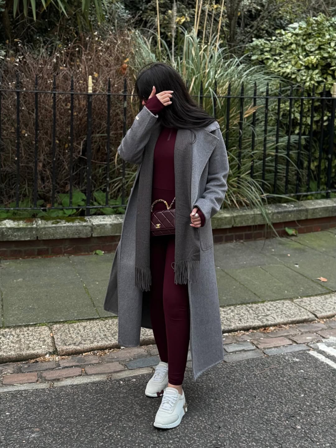 Blending athleisure comfort with sophisticated outerwear defines this practical winter outfit idea for women. A long gray wool coat layers beautifully over a burgundy hoodie and leggings set. White sneakers keep the look sporty while a burgundy quilted crossbody adds luxe texture to casual foundations.