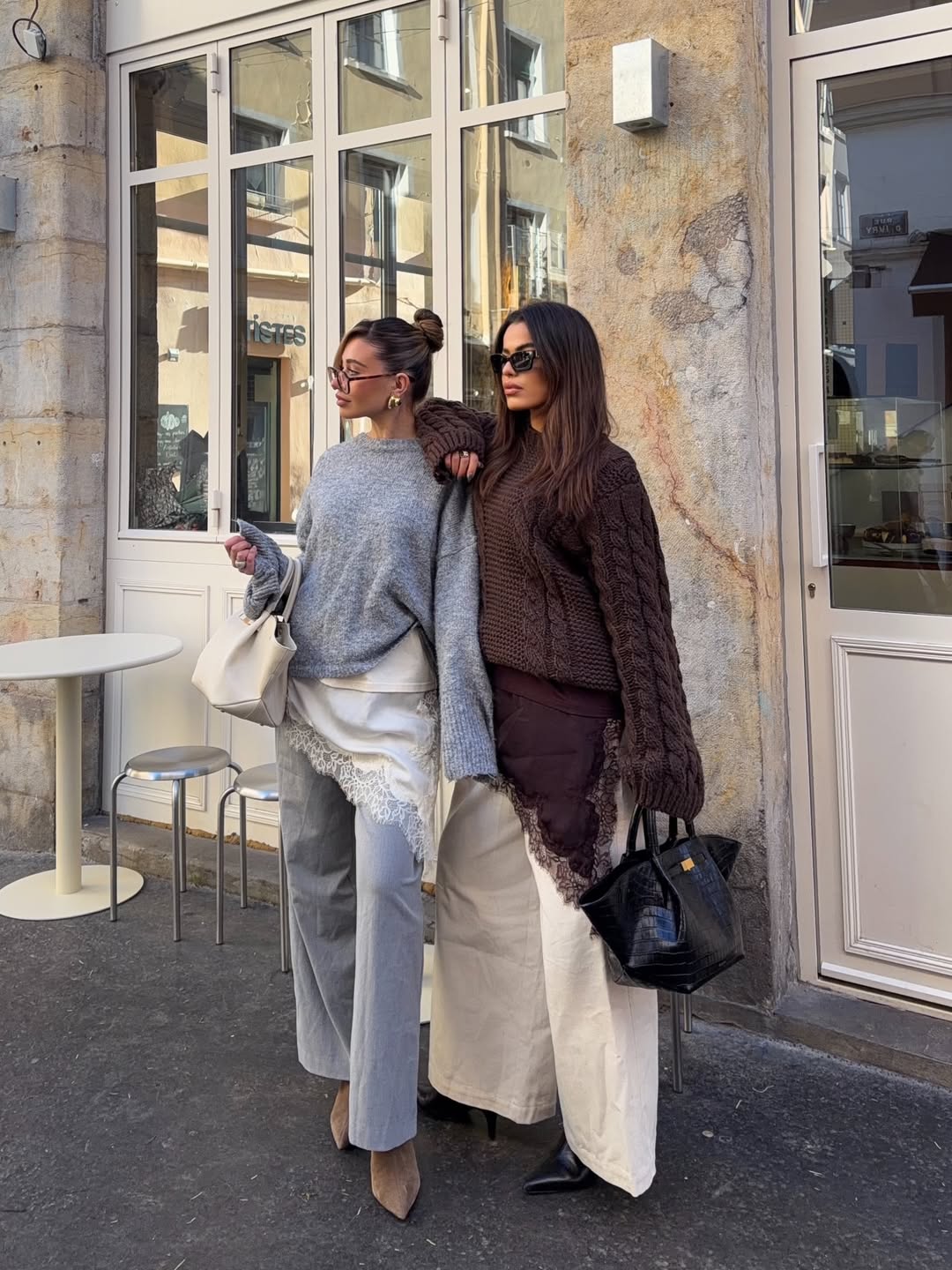 Gathering with friends requires comfortable winter outfit ideas for women like these oversized knit sweaters. Both looks feature chunky textured sweaters in gray and brown paired with neutral toned bottoms. Cream and black tote bags provide practical storage while maintaining the sophisticated aesthetic throughout casual cafe outings.