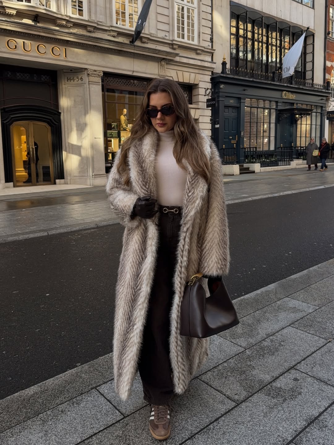 Enveloping yourself in maxi length fur transforms ordinary shopping trips into fashion moments worth documenting. The neutral beige tone coordinates beautifully with both warm and cool color palettes. Black leather gloves and designer sunglasses complete this polished high fashion aesthetic throughout.