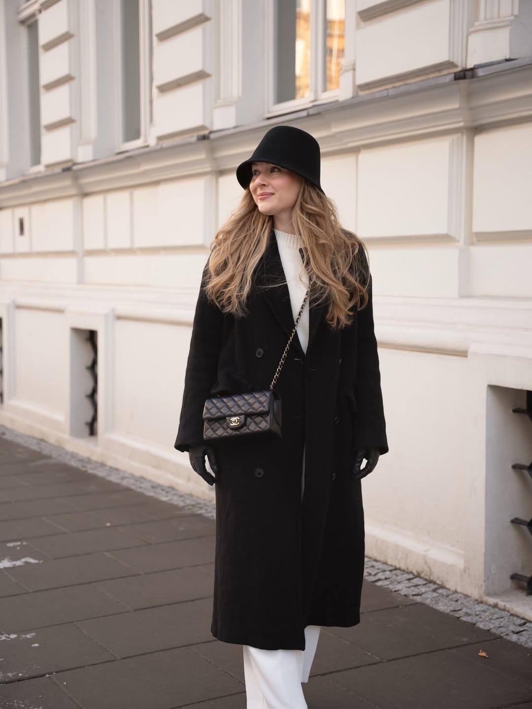 Embracing winter elegance becomes effortless when pairing a long black coat with white trousers. This timeless combination radiates sophistication while keeping you warm during chilly days. The bucket hat adds a contemporary twist to the traditional outfit.