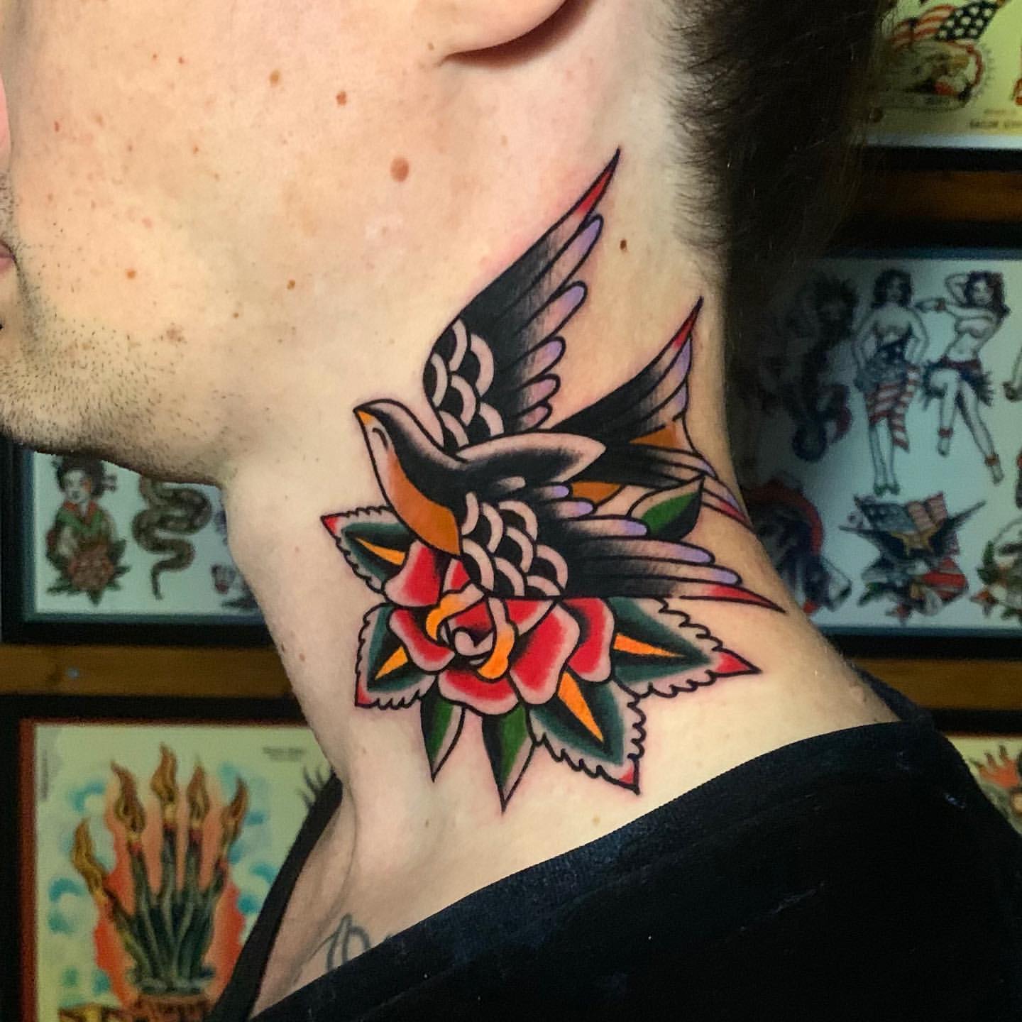 This neck tattoo showcases a classic American traditional swallow with rose, featuring bold black outlines, vibrant red and yellow coloring, and simplified forms that ensure visibility and longevity—hallmarks of the style.