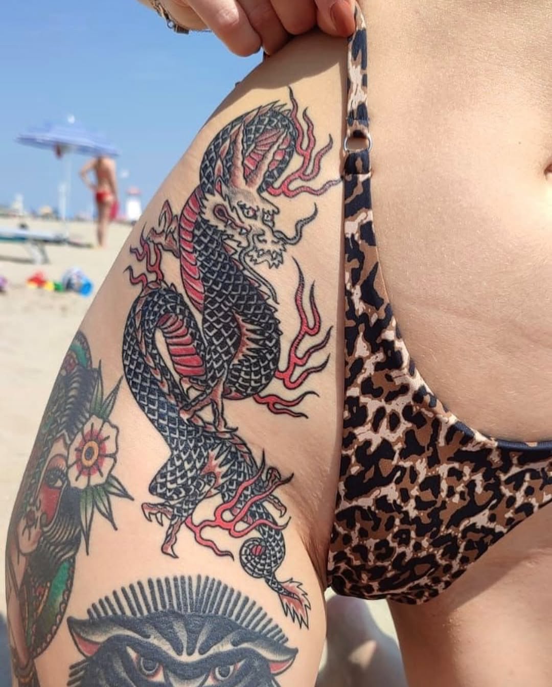 This hip tattoo features an American traditional interpretation of a Japanese dragon, combining bold black outlines and limited color palette with Eastern mythology—demonstrating how traditional tattooing incorporates diverse cultural influences.