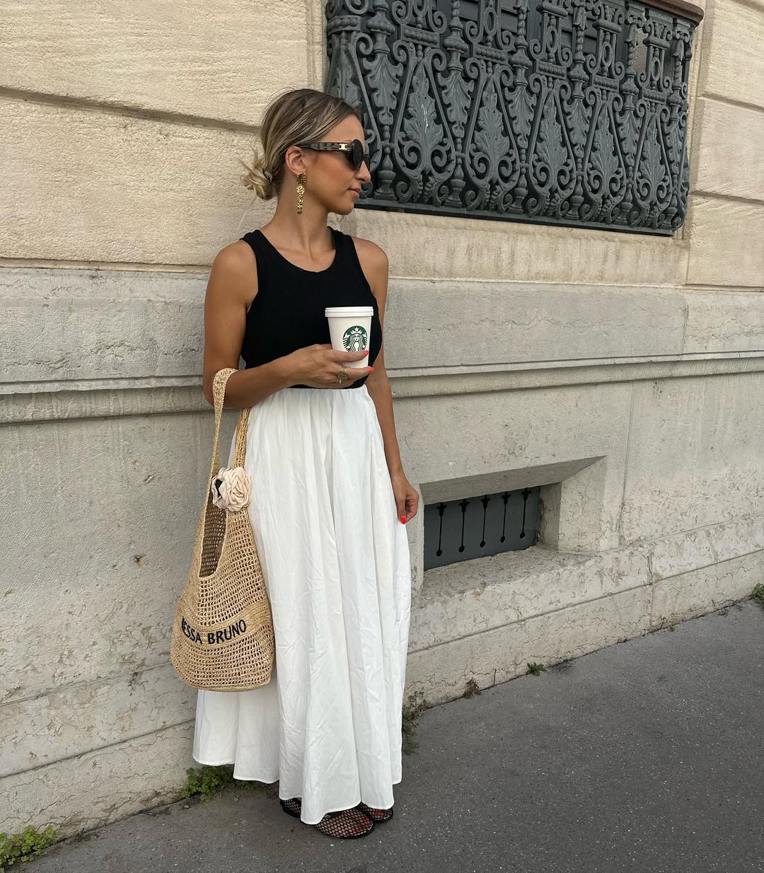 A fitted black tank top tucked into a voluminous white maxi skirt creates a striking summer contrast that feels fresh and airy. Gold drop earrings and bold shield sunglasses bring serious style energy to this simple pairing.