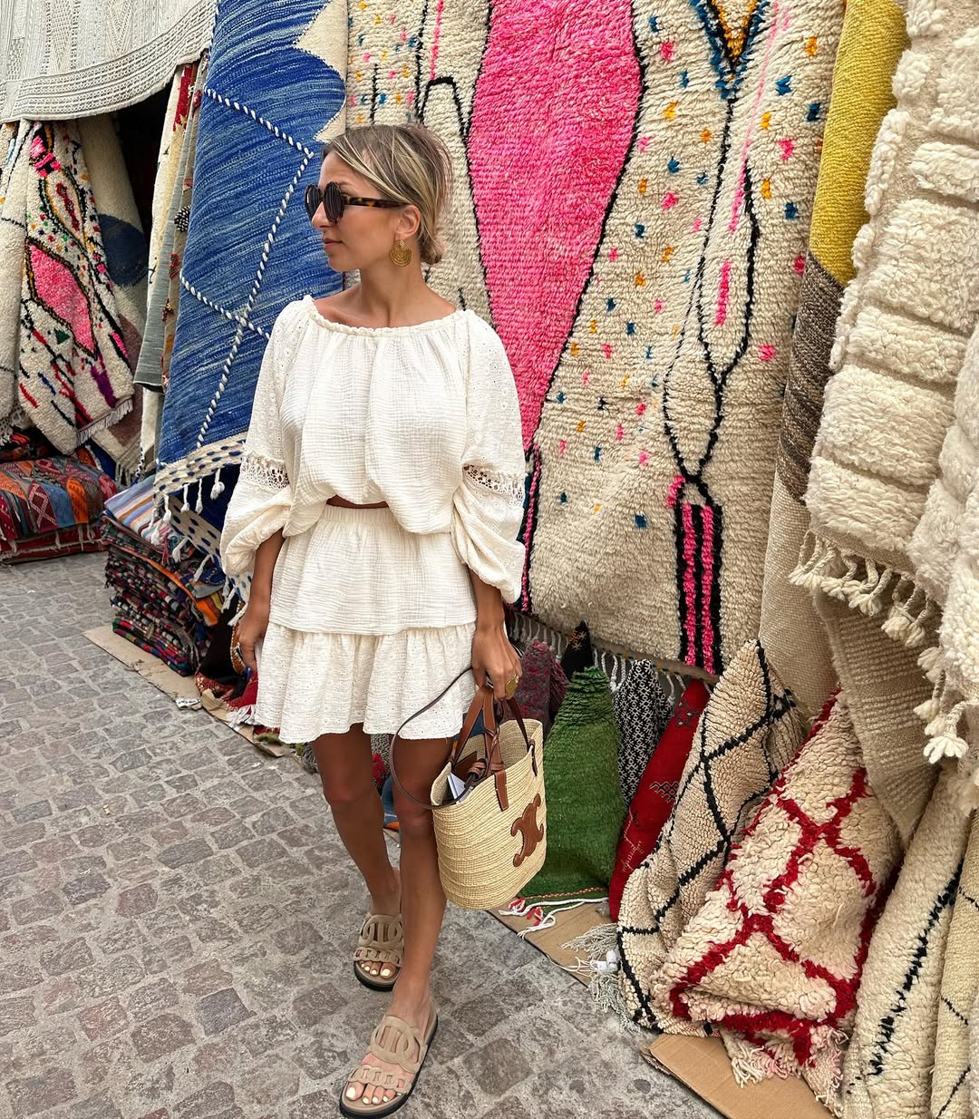 Tan leather slide sandals and a woven rattan handbag with cognac leather trim complete the ensemble beautifully. Gold jewelry and dark sunglasses elevate the overall aesthetic for a chic warm-weather day out.
