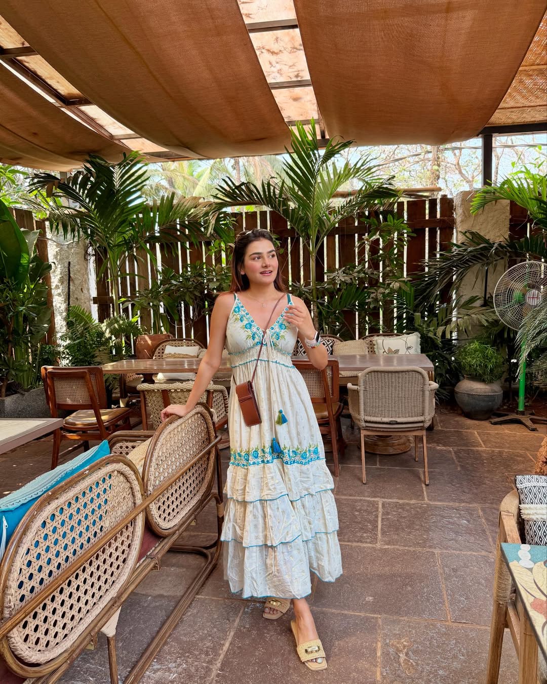Tan embellished wedge slide sandals elevate the look comfortably and stylishly. A small brown leather crossbody bag keeps things practical without breaking the dreamy aesthetic. This tropical garden café setting makes this warm-weather outfit feel genuinely magical and effortlessly summer-ready.