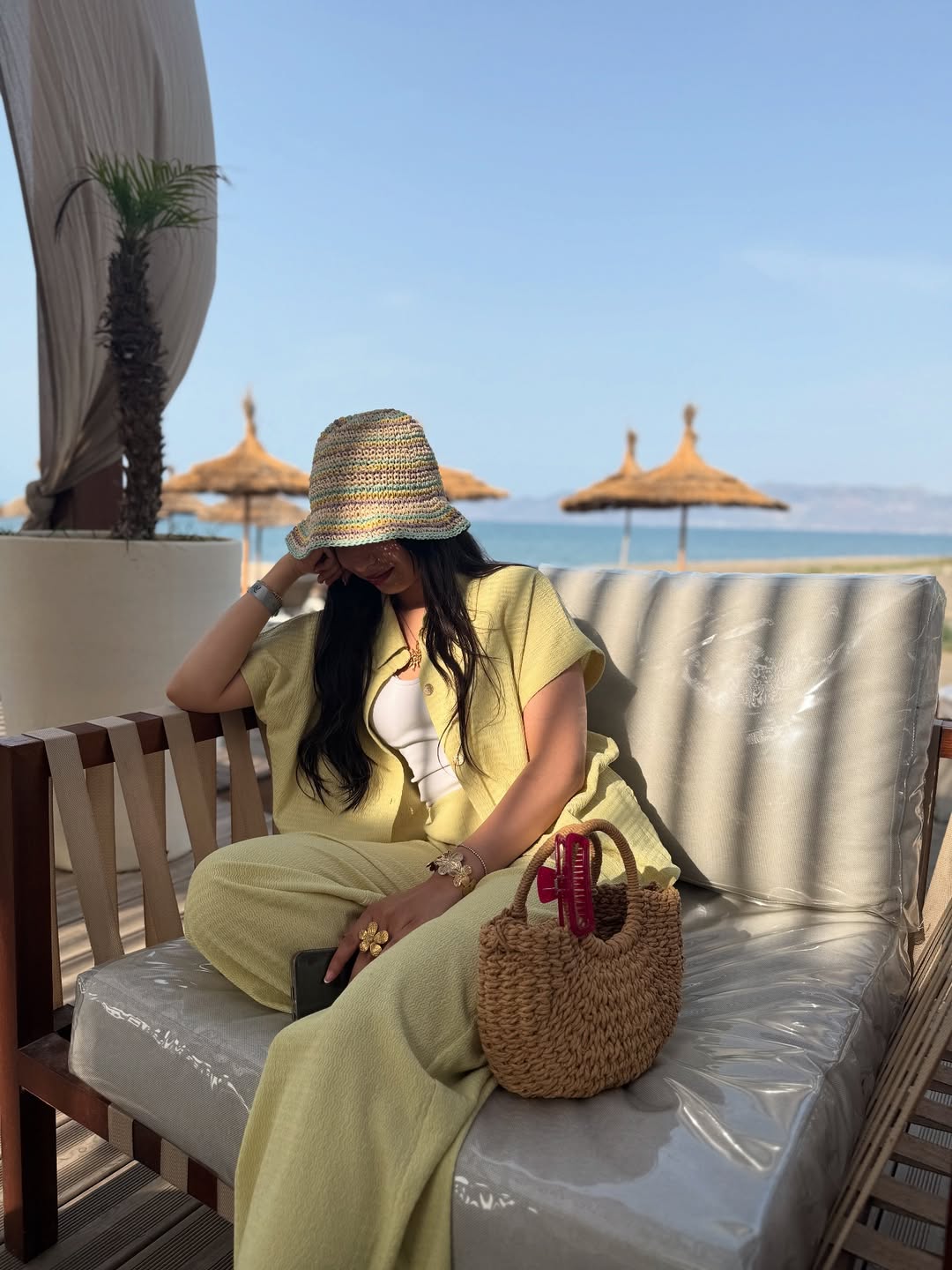 A multicolor crochet bucket hat brings playful handcrafted charm overhead. Paired with a round woven rattan bag and a bold red claw clip, this beachside ensemble radiates effortless laid-back summer sophistication beautifully.