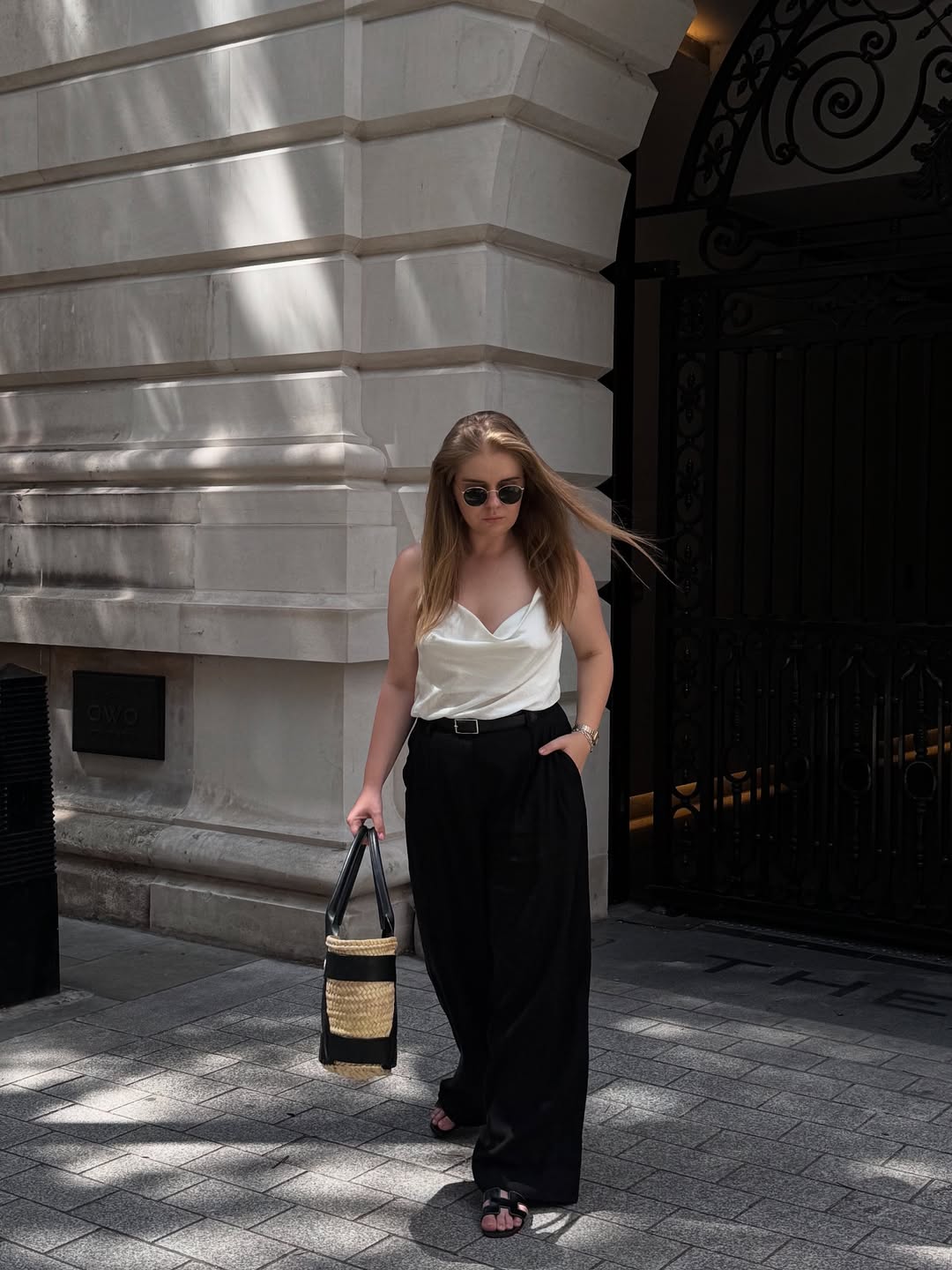 Black leather flat sandals keep the look grounded and comfortable underfoot. A structured woven raffia tote with black leather trim adds a natural textural contrast that works beautifully. Small round sunglasses and a gold watch complete this polished warm-weather city street style look.