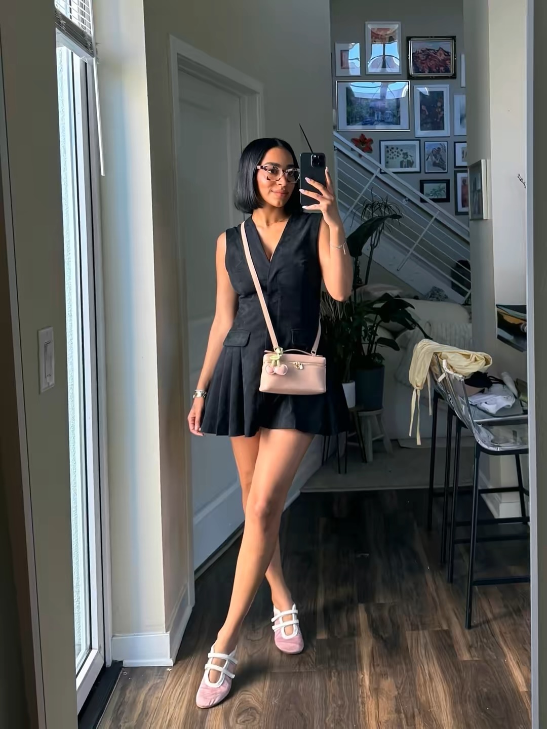 A sharp black sleeveless blazer mini dress with a pleated skirt hem delivers a smart, fashion-forward summer look that transitions effortlessly from day to evening. The V-neckline and tailored silhouette feel polished and put together without trying too hard. Clear frame glasses add a cute intellectual edge.