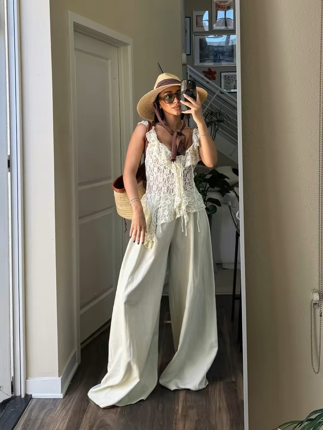 22. White Lace Ruffle Cami Top With Cream Wide Leg Trousers And Straw Hat