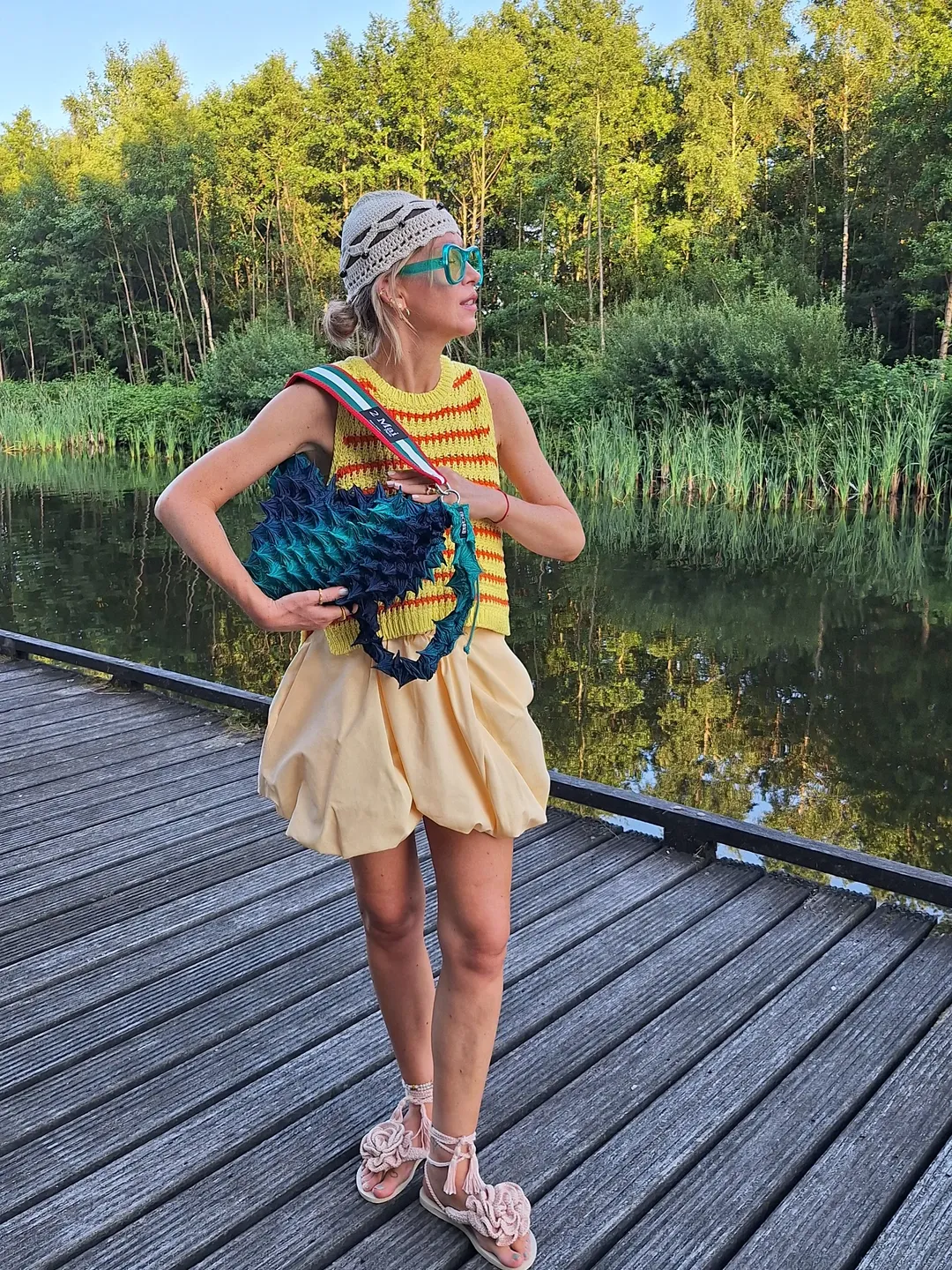 A bold yellow and red striped knit crop top paired with a voluminous butter-toned bubble mini skirt creates a fearlessly artistic summer look. The playful silhouette and handcrafted textures feel genuinely creative and fashion-forward. Teal square frame sunglasses add a striking pop of color.