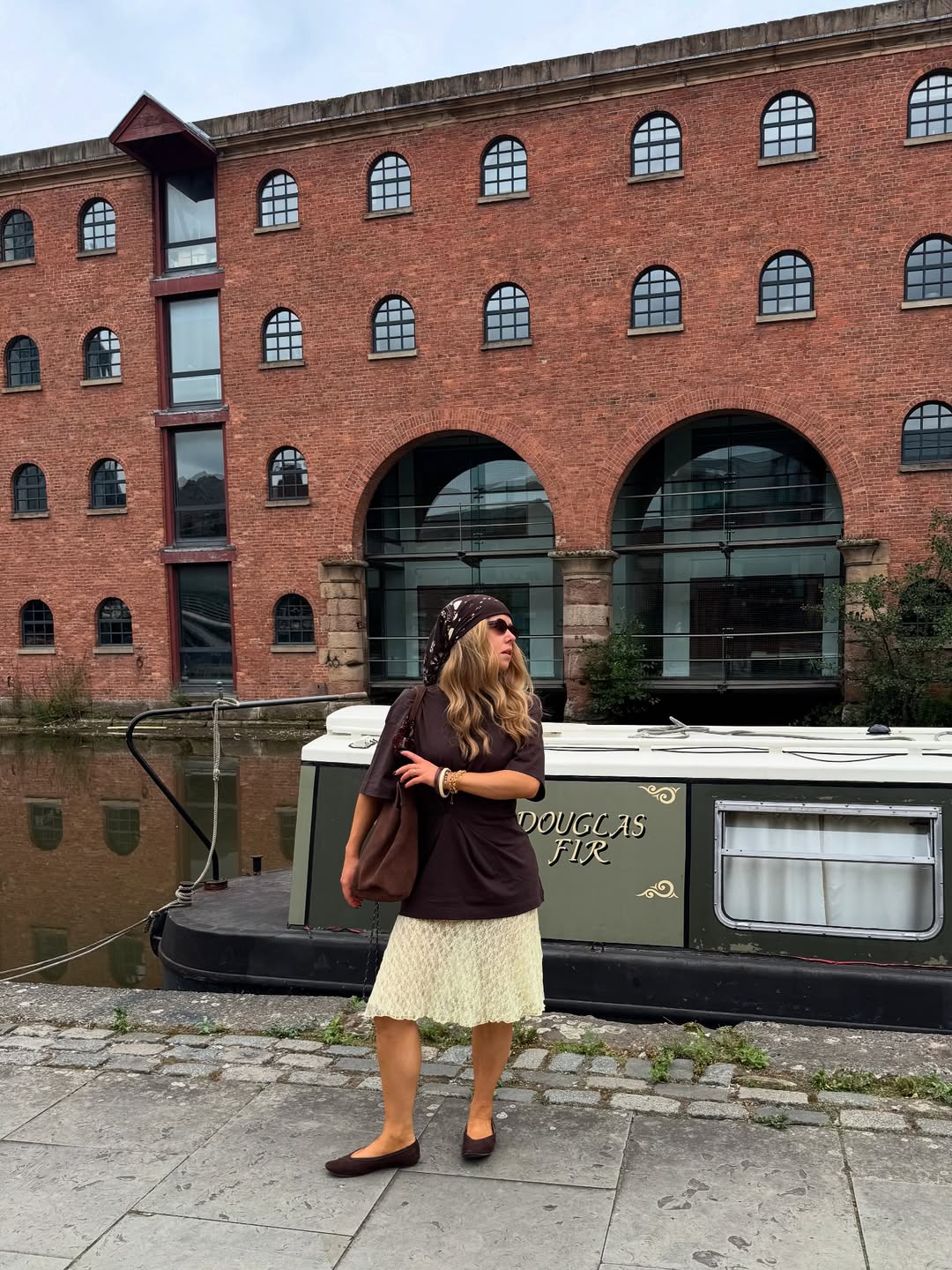 Dark brown ballet flats and a large slouchy brown leather hobo bag keep the tonal palette cohesive and grounded. Gold stacked bracelets add warmth to this understated canalside summer outfit with quiet, timeless appeal.