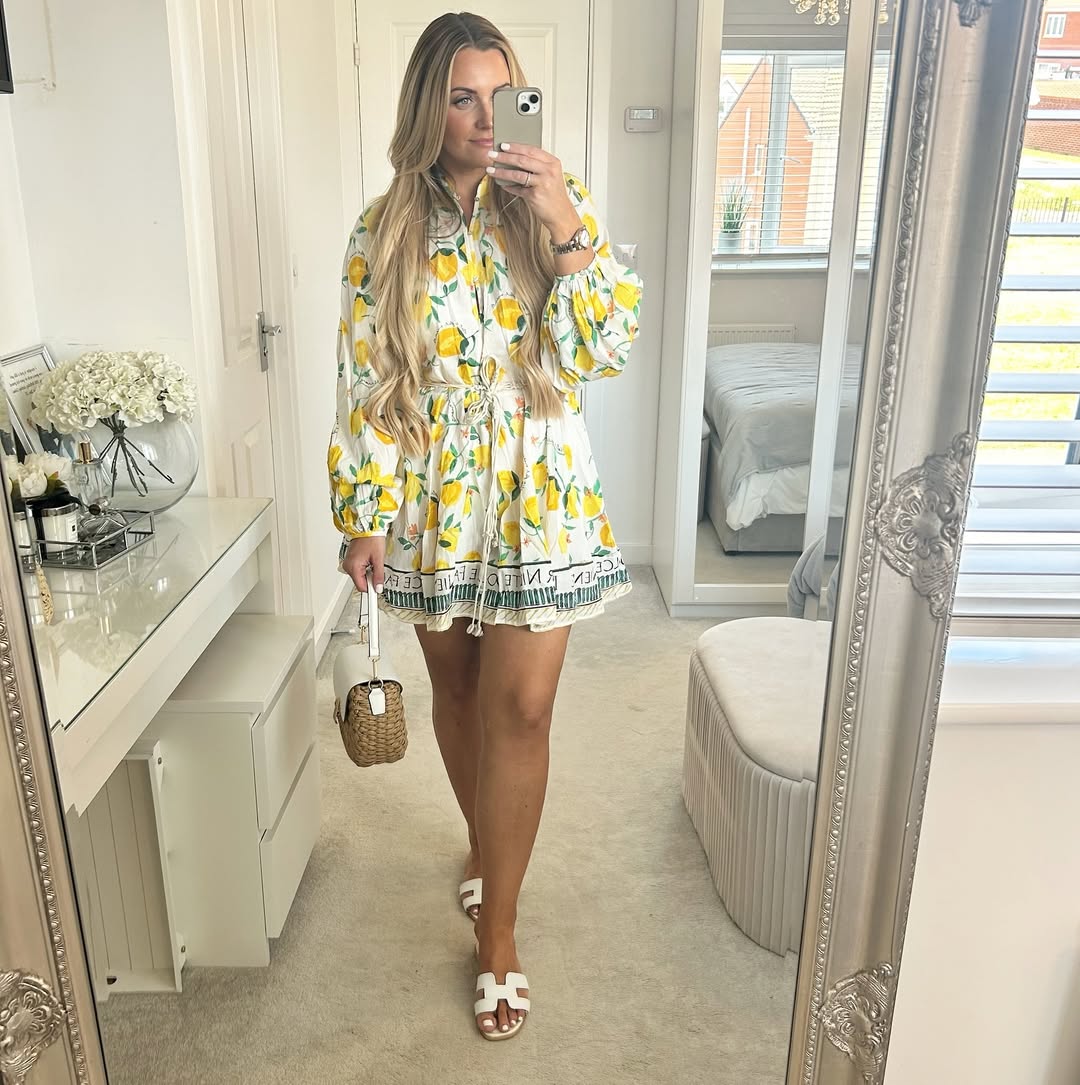 21. Yellow Lemon Print Belted Mini Dress With White Slide Sandals