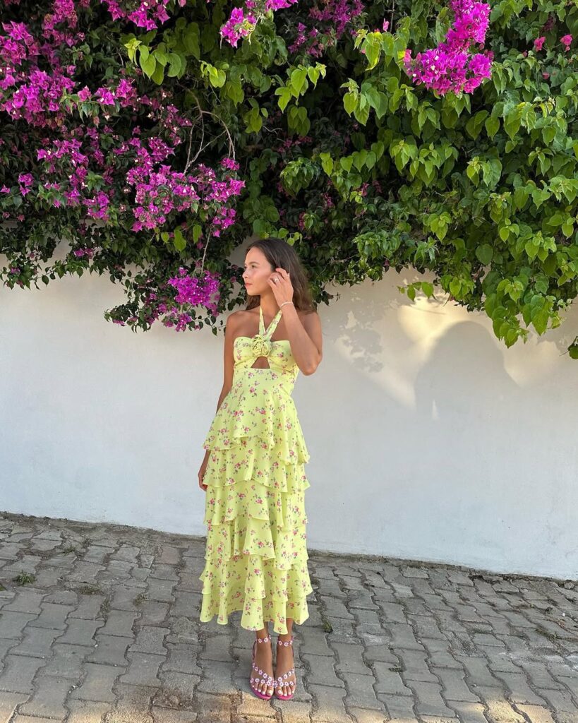 32. Lime Yellow Floral Halter Tiered Ruffle Midi Dress With Daisy Heeled Sandals