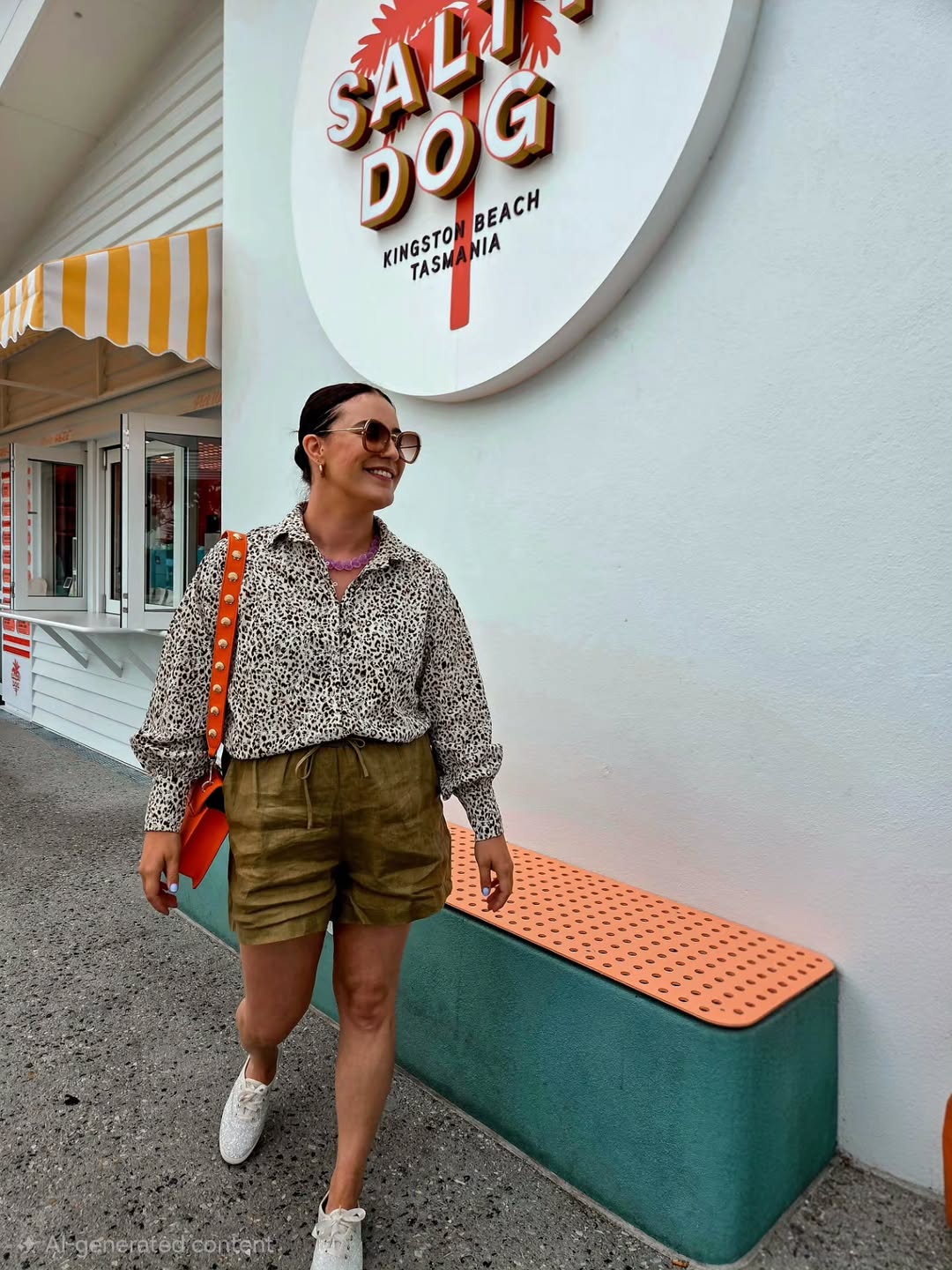 White chunky sneakers keep the look comfortable and street-ready. A vibrant orange structured shoulder bag with gold stud details steals the show as a standout accent piece. Round tinted sunglasses complete this cheerful beachside summer outfit with relaxed confident energy.