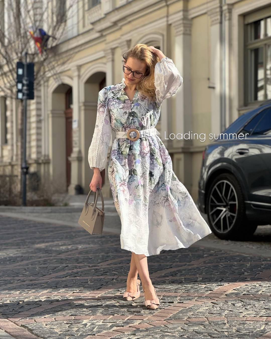 Nude pointed toe bow detail heels add refined femininity that elevates the look effortlessly. A structured taupe mini top-handle bag brings sophisticated contrast. Classic black frame glasses give this cobblestone street summer outfit a charming intellectual finishing touch.