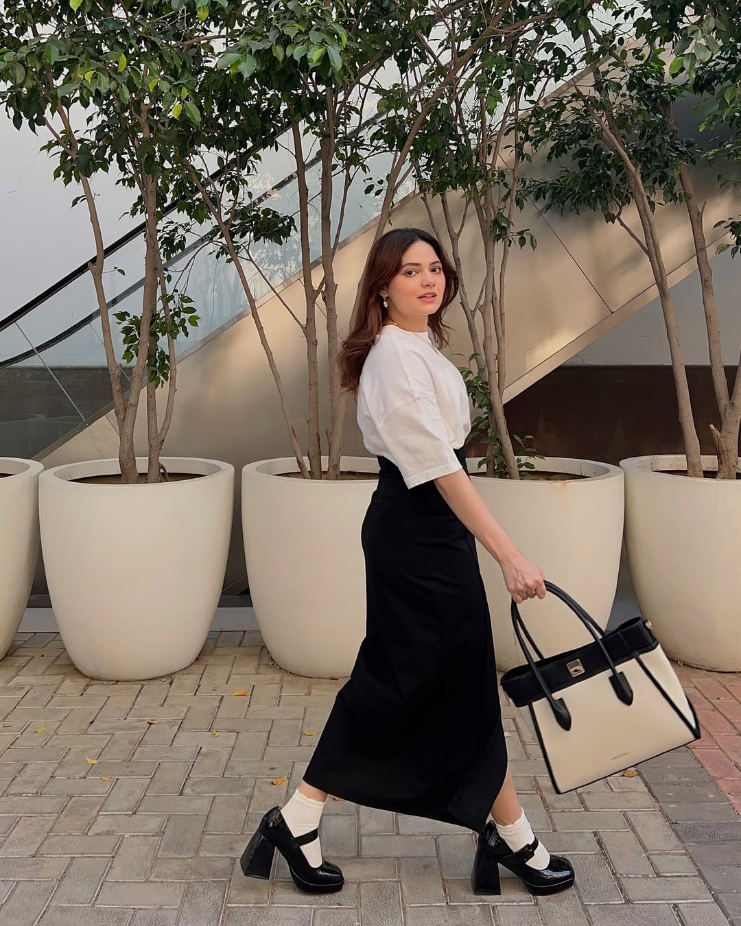 Black patent leather platform Mary Jane heels worn with white ankle socks bring a playful academic-girl aesthetic. A structured two-tone black and cream leather tote bag grounds the look with practical luxury and modern urban polish.
