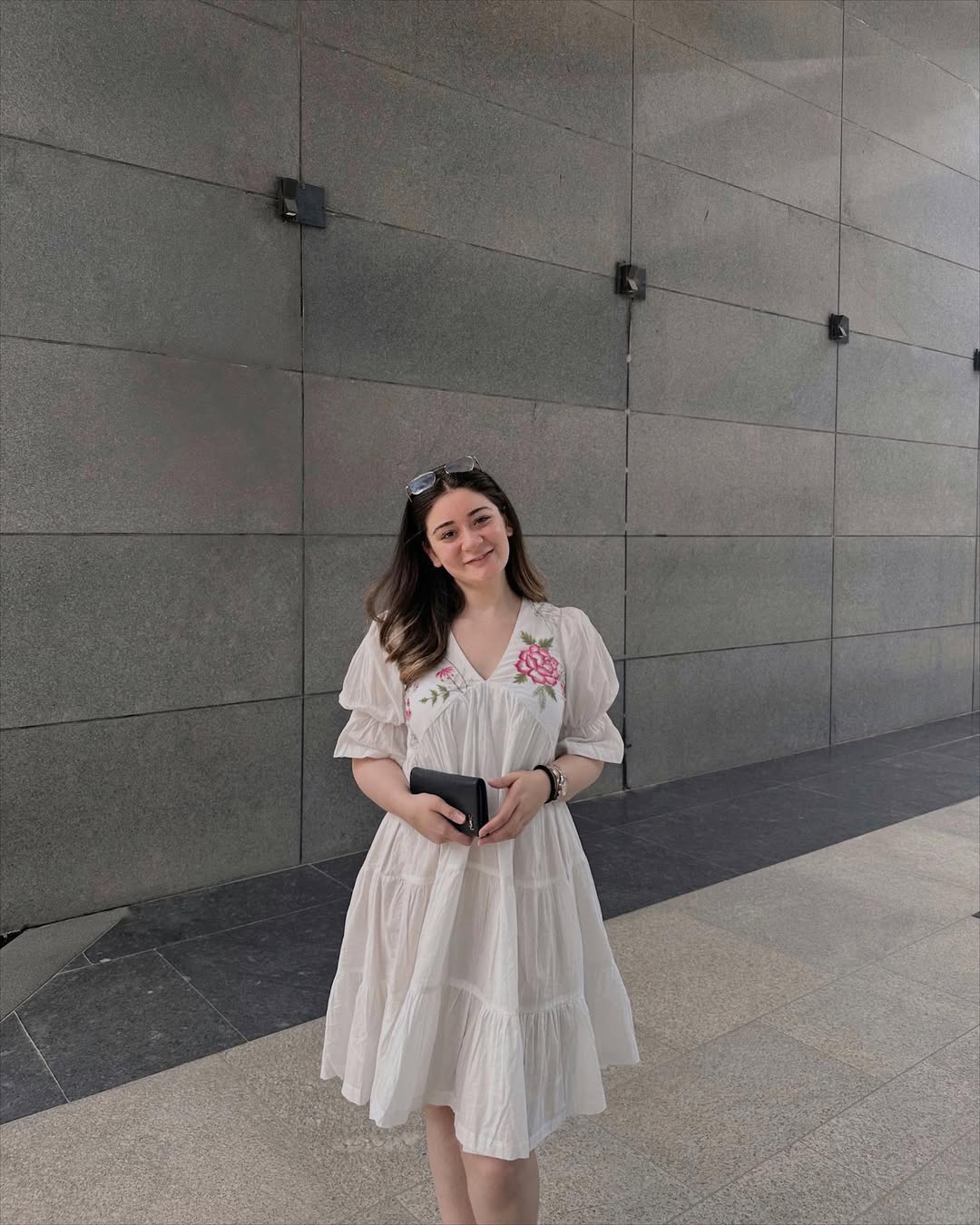 Sunglasses perched casually on the head and a sleek black designer clutch wallet add a stylish, modern contrast to the soft white dress. A gold watch keeps the accessories minimal yet refined, making this look effortlessly put together for sunny summer outings.